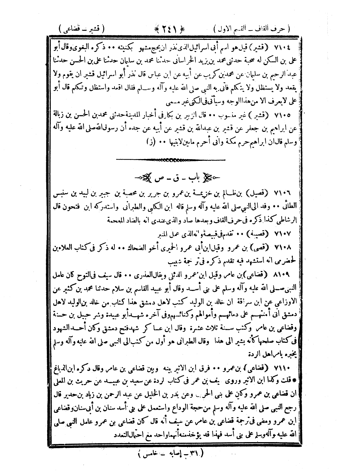 <241> قشير قيل هو اسم أبي إسرائيل الذي نذر ان يحج مشهور بكنيته ذكره البغوي وقال أبو علي بن السكن له صحبة حدثني محمد بن يزيد الخراساني حدثنا علي بن الحسن حدثنا عبد الرحيم بن سليمان عن محمد بن كريب عن أبيه عن بن عباس قال نذر أبو إسرائيل قشير ان يقوم ولا يقعد ولا يستظل مولا يتكلم فاتى به النبي صلى الله عليه وسلم فقال اقعد واستظل وتكلم قال أبو علي لا يعرف الا من هذا الوجه وسيأتي في الكنى غير مسمى قشير غير منسوب قال الزبير بن بكار في أخبار المدينة حدثني محمد بن الحسن بن زبالة عن إبراهيم بن جعفر عن قشير بن عبد الله بن قشير عن أبيه عن جده ان رسول الله صلى الله عليه وسلم قال ان إبراهيم حرم مكة واني احرم ما بين لابتيها القاف بعدها الصاد قصيل بن ظالم بن خزيمة بن عمرو بن جرير بن مخضب بن جبير بن لبيد بن سنبس الطائي وفد الى النبي صلى الله عليه وسلم قاله بن الكلبي والطبراني واستدركه بن فتحون قال الرشاطي كذا ذكره في حرف القاف وبعدها صاد والذي عندي انه بالضاد المعجمة قصيبة تقدم في قبيصة وانه هو الذي عمل المنبر قصي بن عمرو وقيل بن أبي عمرو الحميري أخو الضحاك له ذكر في كتاب العلاء بن الحضرمي انه استشهد فيه تقدم ذكره في ترجمة شبيب قضاعى بن عامر وقيل بن عمرو الدئلي ويقال العذري قال سيف في الفتوح كان عامل النبي صلى الله عليه وسلم على بني أسد وقال أبو عبيد القاسم بن سلام حدثنا محمد بن كثير عن الأوزاعي عن بن سراقة ان خالد بن الوليد كتب لأهل دمشق هذا كتاب من خالد بن الوليد لأهل دمشق اني امنتهم على دمائهم وأموالهم وكنائسهم وفي آخره شهد أبو عبيدة وشرحبيل بن حسنة وقضاعي بن عامر وكتب سنة ثلاث عشرة وقال بن عساكر شهد فتح دمشق وكان أحد الشهود في كتاب صلحها كأنه يشير الى هذا وقال الطبراني هو أول من كتب الى النبي صلى الله عليه وسلم يخبره بأمر أهل الردة قضاعي بن عمرو فرق بن الأثير بينه وبين قضاعى بن عامر وقال ذكره بن الدباغ قلت وكذا بن الأمين وروى سيف بن عمر في كتاب الردة عن سعيد بن عبيد عن حريث بن المعلى ان قضاعي بن عمرو كان على بني الحارث وعن بدر بن الخليل عن عبد الرحمن بن زياد بن حدير قال رجع النبي صلى الله عليه وسلم من حجة الوداع واستعمل على بني أسد سنان بن أبي سنان وقضاعي بن عمرو ومضى في ترجمة قضاعي بن عامر عن سيف انه قال كان قضاعي بن عمرو عامل النبي صلى الله عليه وسلم على بني أسد فهذا قد يؤخذ منه انهما واحد مع احتمال التعدد القاف بعدها الطاء §
