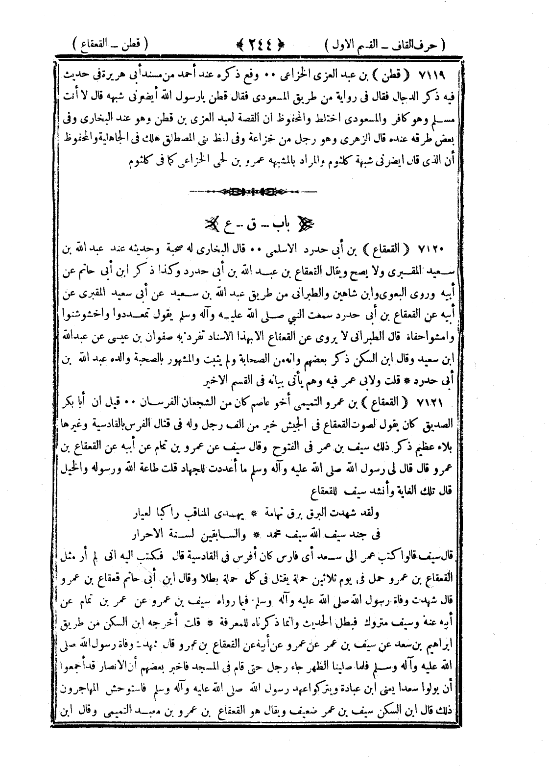<244> قطن بن عبد العزي الخزاعي وقع ذكره عند احمد من مسند بن هريرة في حديث فيه ذكر الدجال فقال في رواية من طريق المسعودي فقال قطن يا رسول الله ايضرني شبهه قال لا أنت مسلم وهو كافر والمسعودي اختلط والمحفوظ ان القصة لعبد العزي بن قطن وهو عند البخاري وفي بعض طرقه عنده قال الزهري وهو رجل من خزاعة وفي لفظ بني المصطلق هلك في الجاهلية والمحفوظ ان الذي قال ايضرني شبهه كلثوم والمراد بالمشبهه عمرو بن لحى الخزاعي كما في كلثوم القاف بعدها العين القعقاع بن أبي حدرد الأسلمي قال البخاري له صحبة وحديثه عند عبد الله بن سعيد المقبري ولا يصح ويقال القعقاع بن عبد الله بن أبي حدرد وكذا ذكر بن أبي حاتم عن أبيه وروى البغوي وابن شاهين والطبراني من طريق عبد الله بن سعيد بن سعيد المقبري عن أبيه عن القعقاع بن أبي حدرد سمعت النبي صلى الله عليه وسلم يقول تمعددوا واخشوشنوا وامشوا حفاة قال الطبراني لا يروي عن القعقاع الا بهذا الإسناد تفرج به صفوان بن عيسى عن عبد الله بن سعيد وقال بن السكن ذكره بعضهم وانه من الصحابة ولم يثبت والمشهور بالصحبة والده عبد الله بن أبي حدرد قلت ولأبي عمر فيه وهم يأتي بيانه في القسم الأخير القعقاع بن عمرو التميمي أخو عاصم كان من الشجعان الفرسان قيل ان أبا بكر الصديق كان يقول لصوت القعقاع في الجيش خير من ألف رجل وله في قتال الفرس بالقادسية وغيرها بلاء عظيم ذكر ذلك سيف بن عمر في الفتوح وقال سيف عن عمرو بن تمام عن أبيه عن القعقاع بن عمرو قال قال لي رسول الله صلى الله عليه وسلم ما أعددت للجهاد قلت طاعة الله ورسوله والخيل قال تلك الغاية وأنشد سيف للقعقاع ولقد شهدت البرق برق تهامة يهدي المناقب راكبا لغبار في جند سيف الله سيف محمد والسابقين لسنة الأحرار قال سيف قالوا كتب عمر الى سعد أي فارس كان افرس في القادسية قال فكتب اليه اني لم ار مثل القعقاع بن عمرو حمل في يوم ثلاثين حملة يقتل في كل حملة بطلا وقال بن أبي حاتم قعقاع بن عمرو قال شهدت وفاة رسول الله صلى الله عليه وسلم فيما رواه سيف بن عمر عن عمرو بن تمام عن أبيه عنه وسيف متروك فبطل الحديث وانما ذكرناه للمعرفة قلت أخرجه بن السكن من طريق إبراهيم بن سعد عن سيف بن عمر عن عمرو عن أبيه عن القعقاع بن عمرو قال شهدت وفاة رسول الله صلى الله عليه وسلم فلما صلينا الظهر جاء رجل حتى قام في المسجد فأخبر بعضهم ان الأنصار قد اجمعوا ان يولوا سعدا يعني بن عبادة ويتركوا عهد رسول الله صلى الله عليه وسلم فاستوحش المهاجرون ذلك قال بن السكن سيف بن عمر ضعيف ويقال هو القعقاع بن عمرو بن معبد التميمي وقال بن §