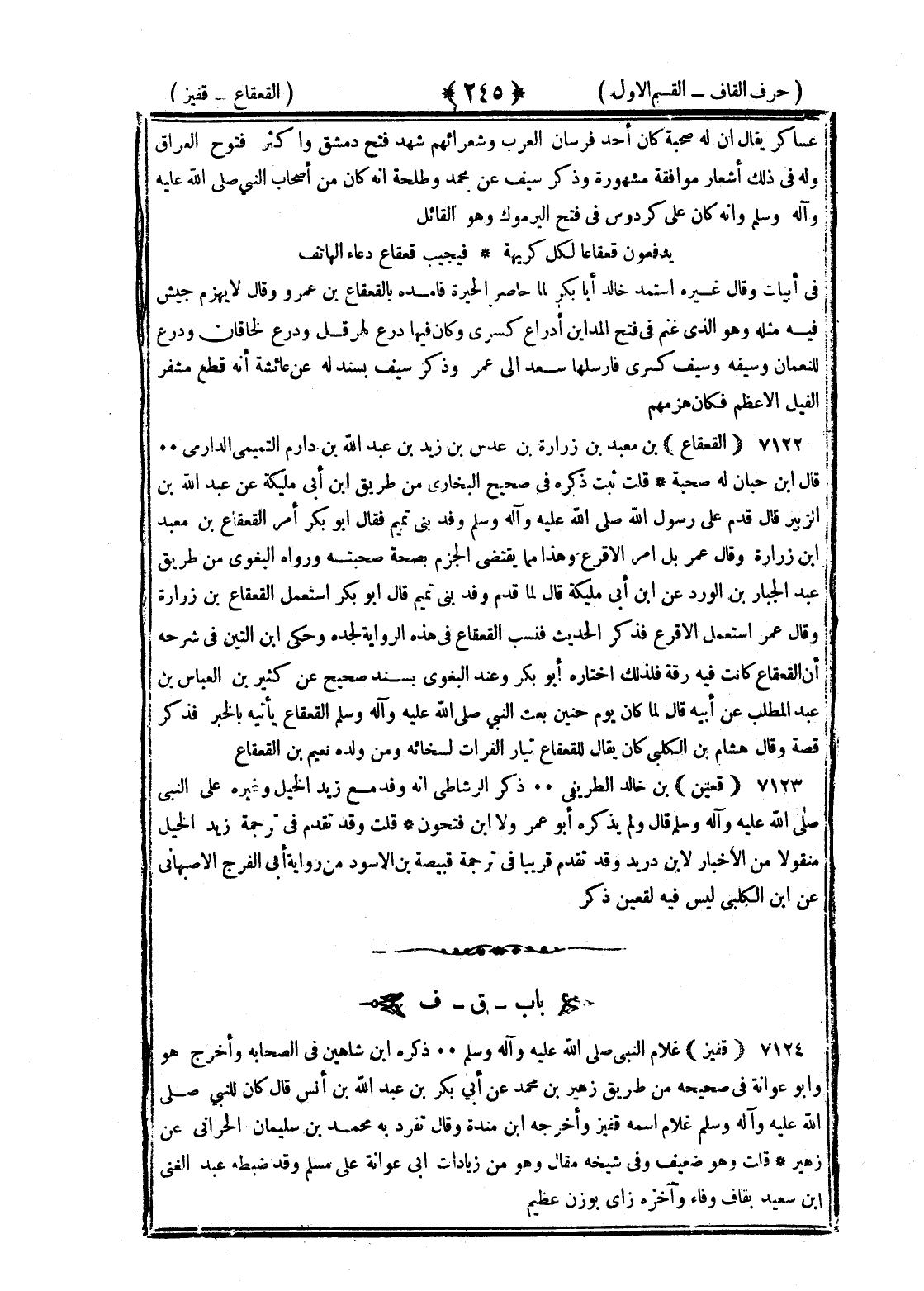 <245> عساكر يقال ان له صحبة كان أحد فرسان العرب وشعرائهم شهد فتح دمشق وأكثر فتوح العراق وله في ذلك اشعار موافقة مشهورة وذكر سيف عن محمد وطلحة انه كان من أصحاب النبي صلى الله عليه وسلم وانه كان على كردوس في فتح اليرموك وهو القائل ويدفعون قعقاعا لكل كريهة فيجيب قعقاع دعاء الهاتف في أبيات وقال غيره استمد خالد أبا بكر لما حاصر الحيرة فامده بالقعقاع بن عمرو وقال لا يهزم جيش فيه مثله وهو الذي غنم في فتح المدائن ادراع كسرى وكان فيها درع هرقل ودرع لخاقان ودرع للنعمان وسيفه وسيف كسرى فارسلها سعد الى عمر وذكر سيف بسند له عن عائشة أنه قطع مشفر الفيل الأعظم فكان هزمهم القعقاع بن معبد بن زرارة بن عدس بن زيد بن عبد الله بن دارم التميمي الدارمي قال بن حبان له صحبة قلت ثبت ذكره في صحيح البخاري من طريق بن أبي مليكة عن عبد الله بن الزبير قال قدم على رسول الله صلى الله عليه وسلم وفد بني تميم فقال أبو بكر أمر القعقاع بن معبد بن زرارة وقال عمر بل أمر الأقرع وهذا مما يقتضي الجزم بصحة صحبته ورواه البغوي من طريق عبد الجبار بن الورد عن بن أبي مليكة قال لما قدم وفد بني تميم قال أبو بكر استعمل القعقاع بن زرارة وقال عمر استعمل الأقرع فذكر الحديث فنسب القعقاع في هذه الرواية لجده وحكى بن التين في شرحه ان القعقاع كانت فيه رقة فلذلك اختاره أبو بكر وعند البغوي بسند صحيح عن كثير بن العباس بن عبد المطلب عن أبيه قال لما كان يوم حنين بعث النبي صلى الله عليه وسلم القعقاع يأتيه بالخبر فذكر قصة وقال هشام بن الكلبي كان يقال للقعقاع تيار الفرات لسخائه ومن ولده نعيم بن القعقاع قعين بن خالد الطريفي ذكر الرشاطي انه وفد مع زيد الخيل وغيره على النبي صلى الله عليه وسلم قال ولم يذكره أبو عمر ولا بن فتحون قلت وقد تقدم في ترجمة زيد الخيل منقولا من الاخبار لابن دريد وقد تقدم قريبا في ترجمة قبيصة بن الأسود من رواية أبي الفرج الأصبهاني عن بن الكلبي ليس فيه لقعين ذكر القاف بعدها الفاء قفير غلام النبي صلى الله عليه وسلم ذكره بن شاهين في الصحابة واخرج هو وأبو عوانة من طريق زهير بن محمد عن أبي بكر بن عبيد الله بن أنس قال كان للنبي صلى الله عليه وسلم غلام اسمه قفيز وأخرجه بن منده وقال تفرد به محمد بن سليمان الحراني عن زهير قلت وهو ضعيف وفي شيخه مقال وهو من زيادات أبي عوانة عن مسلم وقد ضبطه عبد الغني بن سعيد بقاف وفاء آخره زاي بوزن عظيم القاف بعدها اللام §