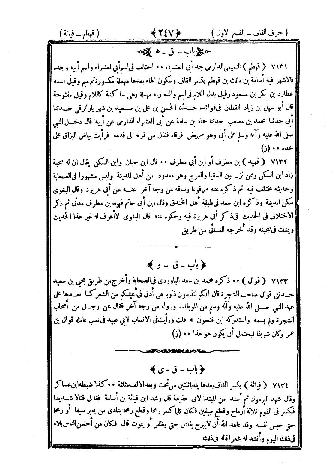 <247> القاف بعدها الهاء قهطم التميمي الدارمي جد أبي العشراء اختلف في اسم أبي العشراء واسم أبيه وجده فالاشهر فيه أسامة بن مالك بن قهطم بكسر القاف وسكون الهاء بعدها مهملة مكسورة ثم ميم وقيل اسمه عطارد بن بلز مسعود وقيل بدل اللام في اسم والده راء مهملة وهي ساكنة كاللام وقيل مفتوحة قال أبو سهل بن زياد القطان في فوائده حدثنا الحسن بن علي بن سعيد بن شهريار الرقي حدثنا أبي حدثنا محمد بن مصعب حدثنا حماد بن سلمة عن أبي العشراء الدارمي عن أبيه قال دخل النبي صلى الله عليه وسلم على أبي وهو مريض فرقاه فتفل من قرنه الى قدمه فرأيت بياض البزاق على خده قهيد بن مطرف أو بن أبي مطرف قال بن حبان وابن السكن يقال ان له صحبة زاد بن السكن وممن نزل بين السقيا والعرج وهو معدود من أهل المدينة وليس مشهورا في الصحابة وحديثه مختلف فيه ثم ذكره عنه مرفوعا وساقه من وجه آخر عن أبي هريرة وقال البغوي سكن المدينة وذكره بن سعد في طبقة أهل الخندق وقال بن أبي حاتم قهيد بن مطرف مدني ثم ذكر الاختلاف بن الحديث في ذكر أبي هريرة فيه وحكوه عنه قال البغوي لا اعرف له غير هذا الحديث ويشك في صحبته وقد أخرجه النسائي من طريق القاف بعدها الواو قوال ذكره محمد بن سعد الباوردي في الصحابة واخرج من طريق يحيى بن سعيد حدثني قوال صاحب الشجرة قال انكم لتذنبون ذنوبا هي أدق في اعينكم من الشعر كنا نعدها على عهد النبي صلى الله عليه وسلم من الموبقات ورواه عن وجه آخر فقال عن رجل من أصحاب الشجرة ولم يسمه واستدركه بن فتحون قلت ورأيت في الأنساب لأبي عبيدة في نسب عاملة قوال بن عمرو كان شريفا فيحتمل ان يكون هو هذا القاف بعدها الياء قياثة بكسر القاف بعدها ياء باثنتين من تحت وبعد الألف مثلثة كذا ضبطه بن عساكر وقال شهد اليرموك ثم اسند من المبتدأ لأبي حذيفة قال وشهد بن قياثة بن أسامة فقاتل قتالا شديدا فكسر في القوم ثلاثة ارماح وقطع سبعين فكان كلما كسر أو قطع رمحا ينادي من يعير سيفا أو رمحا حتى حبس نفسه وقد عاهد الله الا يبرح يقاتل حتى يظفر أو يموت قال فكان من أحسن الناس بلاء في ذلك اليوم وأنشد له شعرا قاله في ذلك §