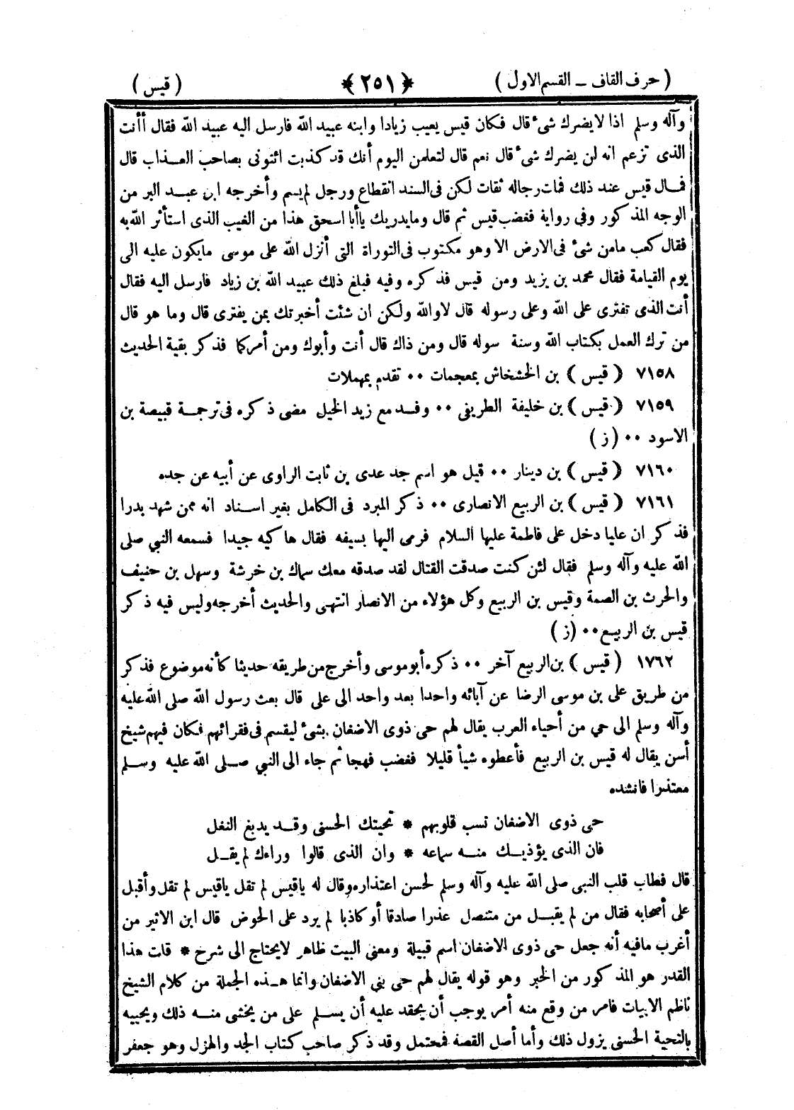 <251> عليه وسلم إذا لا يضرك شيء قال فكان قيس يعيب زيادا وابنه عبد الله فأرسل اليه عبيد الله فقال أأنت الذي تزعم انه لن يضرك شيء قال نعم قال لتعلمن اليوم انك قد كذبت ائتوني بصاحب العذاب قال فمال قيس عند ذلك فمات رجاله ثقات لكن في السند انقطاع ورجل لم يسم وأخرجه بن عبد البر من الوجه المذكور وفي رواية فغضب قيس ثم قال وما يدريك يا أبا إسحاق هذا من الغيب الذي استأثر الله به فقال كعب ما من شيء في الأرض الا وهو مكتوب في التوراة التي انزل الله على موسى ما يكون عليه الى يوم القيامة فقال محمد بن يزيد ومن قيس فذكره وفيه فبلغ ذلك عبيد الله بن زياد فأرسل اليه فقال أنت الذي تفتري على الله وعلى رسوله قال لا والله ولكن ان شئت اخبرتك بمن يفترى قال ومن هو قال من ترك العمل بكتاب الله وسنة رسوله قال ومن ذاك قال أنت وأبوك ومن امركما وذكر بقية الحديث قيس بن الخشخاش بمعجمات تقدم بمهملات قيس بن خليفة الطرائفي وفد مع زيد الخيل مضى ذكره في ترجمة قبيصة بن الأسود قيس بن دينار قيل هو اسم جد عدي بن ثابت الراوي عن أبيه عن جده قيس بن الربيع الأنصاري ذكر المبرد في الكامل بغير إسناد انه ممن شهد بدرا فذكر ان عليا دخل على فاطمة عليها السلام فرمى إليها بسيفه فقال هاكيه حميدا فسمعه النبي صلى الله عليه وسلم فقال لئن كنت صدقت القتال لقد صدقه معك سماك بن خرشة وسهل بن حنيف والحارث بن الصمة وقيس بن الربيع وكل هؤلاء من الأنصار انتهى والحديث أخرجه وليس فيه ذكر قيس بن الربيع قيس بن الربيع آخر ذكره أبو موسى واخرج من طريقه حديثا كأنه موضوع فذكر من طريق علي بن موسى الرضا عن آبائه واحدا بعد واحد الى علي قال بعث رسول الله صلى الله عليه وسلم الى حي من احياء العرب يقال لهم حي ذوي الاضغان بشيء ليقسم في فقرائهم فكان فيهم شيخ أسن يقال له قيس بن الربيع فأعطوه شيئا قليلا فغضب فهجا ثم جاء إلى النبي صلى الله عليه وسلم معتذرا فأنشده حي ذوي الاضغان تسب قلوبهم تحيتك الحسنى وقد يدفع النغل فان الذي يؤذيك منه سماعه وان الذي قالوا وراءك لم يقل قال فطاب قلب النبي صلى الله عليه وسلم لحسن اعتذاره وقال له يا قيس لم تقل واقبل على اصحابه فقال من لم يقبل من متنصل عذرا صادقا أو كاذبا لم يرد على الحوض قال بن الأثير من أغرب ما فيه انه جعل حي ذوي الاضغان اسم قبيلة ومعنى البيت ظاهر لا يحتاج الى شرح قلت هذا القدر هو المذكور من الخبر وهو قوله يقال لهم حي بني الاضغان وانما هذه الجملة من كلام الشيخ ناظم الأبيات فأمر من وقع منه أمر يوجب ان يحقد عليه ان يسلم على من يخشى منه ذلك ويحييه بالتحية الحسنى يزول ذلك واما أصل القصة فمحتمل وقد ذكر صاحب الجد والهزل وهو جعفر §