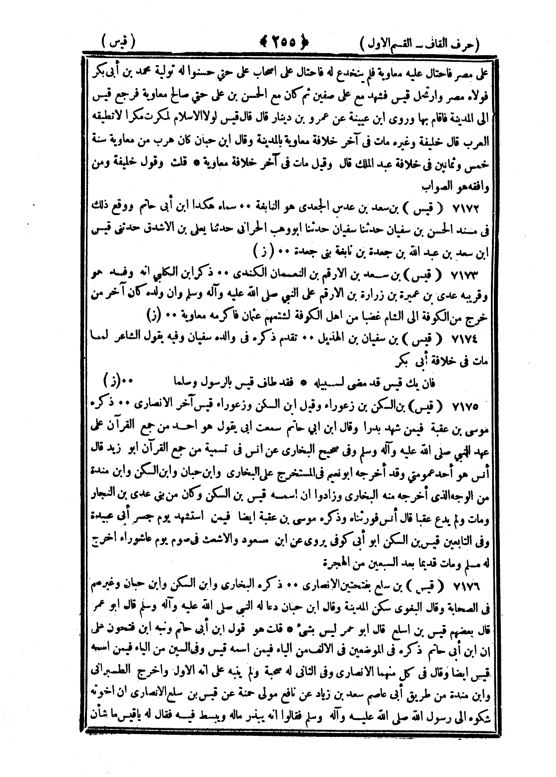 <255> على مصر فاحتال عليه معاوية فلم ينخدع له فاحتال على أصحاب على حتى حسنوا له تولية محمد بن أبي بكر فولاه مصر وارتحل قيس فشهد مع على صفين ثم كان مع الحسن بن علي حتى صالح معاوية فرجع قيس الى المدينة فأقام بها وروى بن عيينة عن عمرو بن دينار قال قال قيس لولا الإسلام لمكرت مكرا لا تطيقه العرب قال خليفة وغيره مات في آخر خلافة معاوية بالمدينة وقال بن حبان كان هرب من معاوية ومات سنة خمس وثمانين في خلافة عبد الملك قال وقيل مات في آخر خلافة معاوية قلت وقول خليفة ومن وافقه هو الصواب قيس بن سعد بن عدس الجعدي هو النابغة سماه هكذا بن أبي حاتم ووقع ذلك في مسند الحسن بن سفيان حدثنا سفيان حدثنا أبو وهب الحراني حدثنا يعلى بن الأشدق حدثني قيس بن سعد بن عبد الله بن جعدة بن نابغة عن جعدة قيس بن سعد بن الأرقم بن النعمان الكندي ذكر بن الكلبي انه وفد هو وقريبه عدي بن عميرة بن زرارة بن الأرقم على النبي صلى الله عليه وسلم وان ولده كان آخر من خرج من الكوفة الى الشام غضبا من أهل الكوفة لشتمهم عثمان فاكرمه معاوية قيس بن سفيان بن الهديل تقدم ذكره في والده سفيان وفيه يقول الشاعر لما مات في خلافة أبي بكر فان يك قيس قد مضى لسبيله فقد طاف قيس بالرسول وسلما قيس بن السكن بن زعوراء وقيل بين السكن وزعوراء قيس آخر الأنصاري ذكره موسى بن عقبة فيمن شهد بدرا وقال بن أبي حاتم سمعت أبي يقول هو أحد من جمع القرآن على عهد النبي صلى الله عليه وسلم وفي صحيح البخاري عن أنس في تسمية من جمع القرآن أبو زيد قال أنس هو أحد عمومتي وقد أخرجه أبو نعيم في المستخرج عن البخاري وابن حبان وابن السكن وابن منده من الوجه الذي أخرجه منه البخاري زادوا ان اسمه قيس بن السكن وكان من بني عدي بن النجار ومات ولم يدع عقبا قال أنس فورثناه وذكره موسى بن عقبة أيضا فيمن استشهد يوم جسر أبي عبيد وفي التابعين قيس بن السكن أبو أبي كوفي يروي عن بن مسعود والاشعث في صوم يوم عاشوراء اخرج له مسلم ومات قديما بعد السبعين من الهجرة قيس بن سلع بفتحتين الأنصاري ذكره البخاري وابن السكن وابن حبان وغيرهم في الصحابة وقال البغوي سكن المدينة وقال بن حبان دعا له النبي صلى الله عليه وسلم قال أبو عمر قال بعضهم قيس بن اسلع قال أبو عمر ليس بشيء قلت هو قول بن أبي حاتم ونبه بن فتحون على ان بن أبي حاتم ذكره في الموضعين في الألف من الياء فيمن اسمه قيس وفي السين من الياء فيمن اسمه قيس أيضا وقال في كل منهما الأنصاري وفي الثاني له صحبة ولم ينبه على انه الأول واخرج الطبراني وابن منده من طريق أبي عاصم سعد بن زياد عن نافع مولى حمنة عن قيس بن سلع الأنصاري ان إخوته شكوه الى رسول الله صلى الله عليه وسلم فقالوا انه يبذر ماله ويبسط فيه فقال له يا قيس ما شأن §