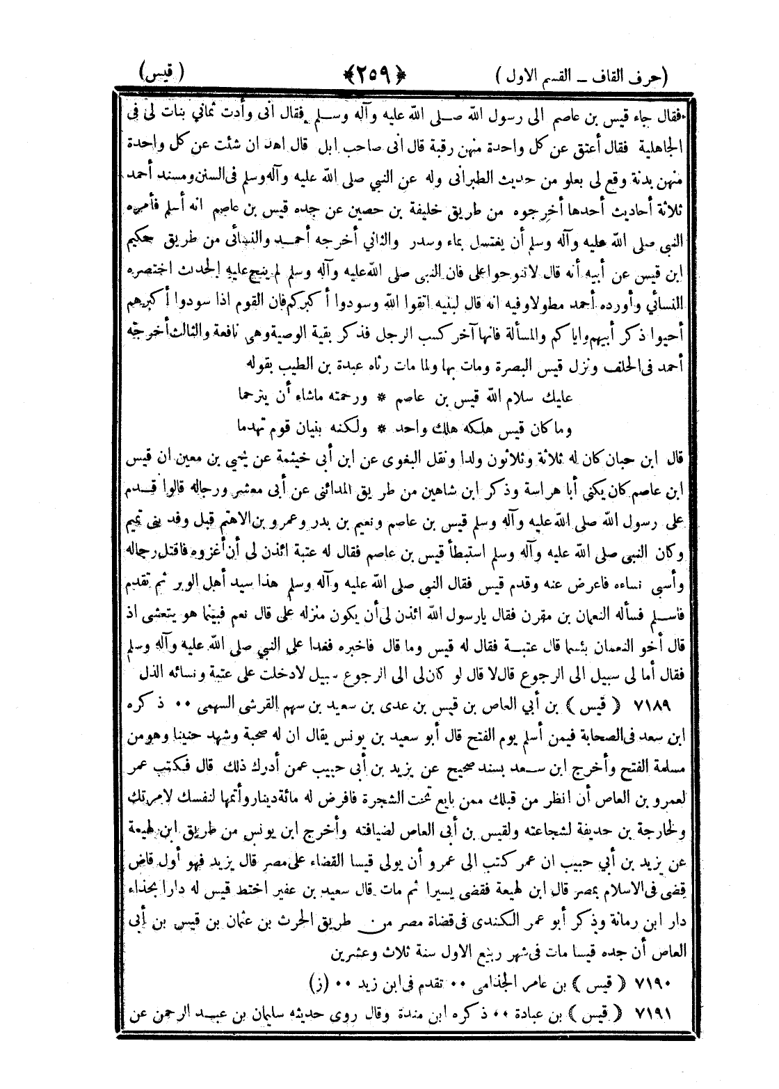 <259> فقال جاء قيس بن عاصم الى رسول الله صلى الله عليه وسلم فقال اني وادت ثماني بنات لي في الجاهلية فقال اعتق عن كل واحدة منهن رقبة قال اني صاحب إبل قال اهد ان شئت عن كل واحدة منهن بدنة ووقع لي بعلو من حديث الطهراني وله عن النبي صلى الله عليه وسلم في السنن ومسند احمد ثلاثة أحاديث أحدها أخرجوه من طريق خليفة بن حصين عن جده قيس بن عاصم انه اسلم فأمر النبي صلى الله عليه وسلم ان يغتسل بماء وسدر والثاني أخرجه احمد والنسائي من طريق حكيم بن قيس عن أبيه انه قال لا تنوحوا على فان النبي صلى الله عليه وسلم لم ينح عليه الحديث اختصره النسائي وأورده احمد مطولا وفيه أنه قال لبنيه اتقوا الله وسودوا أكبركم فإن القوم إذا سودوا أكبرهم احيوا ذكر أبيهم وإياكم والمسألة فانها آخر كسب الرجل فذكر بقية الوصية وهي نافعة والثالث أخرجه احمد في الحلف ونزل قيس البصرة ومات بها ولما مات رثاه عبدة بن الطيب بقوله عليك سلام الله قيس بن عاصم ورحمته ما شاء ان يترحما ويقول فيها وما كان قيس هلكه هلك واحد ولكنه بنيان قوم تهدما قال بن حبان كان له ثلاثة وثلاثون ولدا ونقل البغوي عن بن أبي خيثمة عن يحيى بن معين ان قيس بن عاصم كان يكنى أبا هراسة وذكر بن شاهين من طريق المدائني عن أبي معشر ورجاله قالوا قدم على رسول الله صلى الله عليه وسلم قيس بن عاصم ونعيم بن بدر وعمرو بن الاهتم قبل وفد بني تميم وكان النبي صلى الله عليه وسلم استبطأ قيس بن عاصم فقال له عتبة ائذن لي ان اغزوه فاقتل رجاله وأسبي نساءه فاعرض عنه وقجم قيس فقال النبي صلى الله عليه وسلم هذا سيد أهل الوبر ثم تقدم فاسلم فسأله النعمان بن مقرن فقال يا رسول الله ائذن لي ان يكون منزله على قال نعم فبينما هو يتمشى إذ قال أخو النعمان بئسما قال عتبة فقال له قيس وما قال فأخبره فغدا على النبي صلى الله عليه وسلم فقال أمالي سبيل الى الرجوع قال لا قال لو كان لي إلى الرجوع سبيل لادخلت على عتبة ونسائه الذل قيس بن أبي العاص بن قيس بن عدي بن سعيد بن سهم القرشي السهمي ذكره بن سعد في الصحابة فيمن اسلم يوم الفتح قال أبو سعيد بن يونس يقال ان له صحبة وشهد حنينا وهو من مسلمة الفتح واخرج بن سعد بسند صحيح عن يزيد بن حبيب عمن أدرك ذلك قال فكتب عمر لعمرو بن العاص ان انظر من قبلك ممن بايع تحت الشجرة فافرض له مائة ديتار وأتمها لنفسك لامرتك ولخارجة بن حذيفة لشجاعته ولقيس بن أبي العاص لضيافته واخرج بن يونس من طريق بن لهيعة عن يزيد بن أبي حبيب ان عمر كتب الى عمرو ان يولى قيسا القضاء على مصر قال يزيد فهو أول قاض في الإسلام بمصر قال بن لهيعة فقضى يسيرا ثم مات قال سعيد بن عفير اختط قيس له دارا بحذاء دار بن رمانة وذكر أبو عمر الكندي في قضاة مصر من طريق الحارث بن عثمان بن قيس بن أبي العاص ان جده قيسا مات في شهر ربيع الأول سنة ثلاث وعشرين قيس بن عامر الجذامي تقدم في بن زيد قيس بن عبادة ذكره بن منده وقال روى حديثه سليمان بن عبد الرحمن عن §