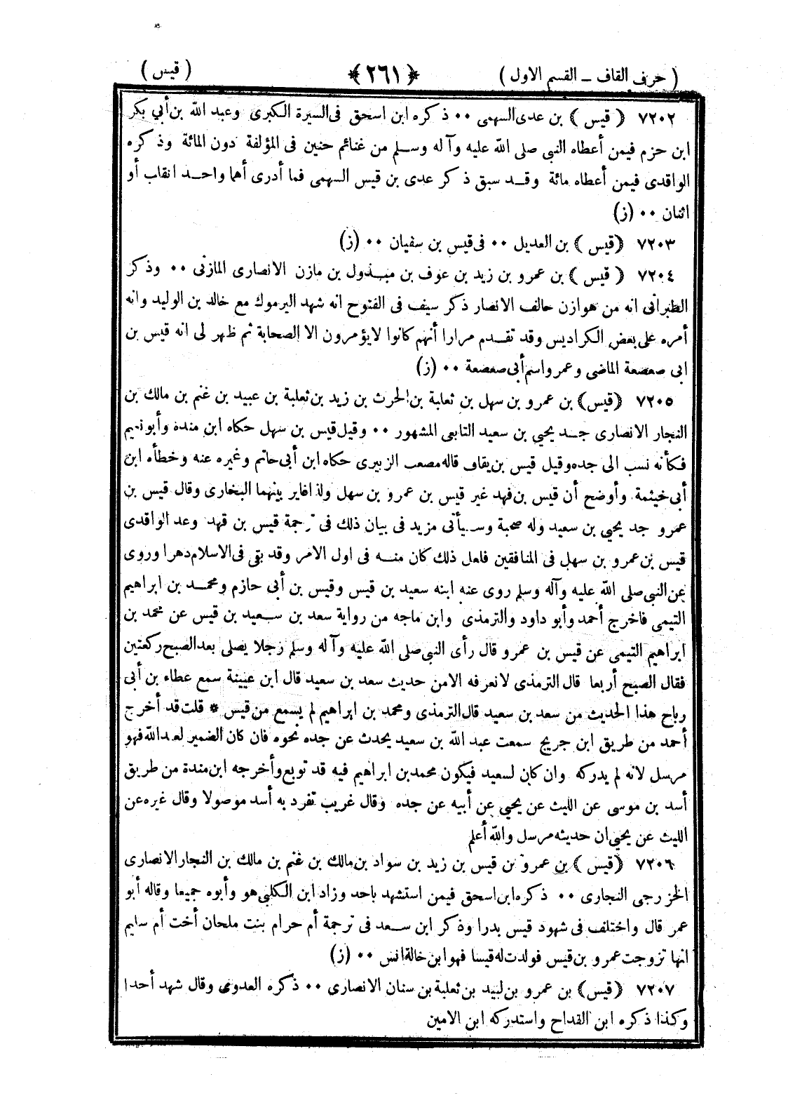 <261> قيس بن عدي السهمي ذكره بن إسحاق في السيرة الكبرى وعبد الله بن أبي بكر بن حزم فيمن أعطاه النبي صلى الله عليه وسلم من غنائم حنين في المؤلفة دون المائة وذكره الواقدي فيمن أعطاه مائة وقد سبق ذكر عدي بن قيس السهمي فما أدري اهما واحد انقلب أو اثنان قيس بن الهذيل في قيس بن سفيان قيس بن عمرو بن زيد بن عوف بن مبذول بن مازن الأنصاري المازني وذكر الطبراني انه من هوازن حالف الأنصار وذكر سيف في الفتوح انه شهد اليرموك مع خالد بن الوليد وانه امره على الكراديس وقد تقدم مرارا انهم كانوا لا يؤمرون الا الصحابة ثم ظهر لي انه قيس بن أبي صعصعة الماضي وعمرو اسم أبي صعصعة قيس بن عمرو بن سهل بن ثعلبة بن الحارث بن زيد بن ثعلبة بن عبيد بن غنم بن مالك بن النجار الأنصاري جد يحيى بن سعيد التابعي المشهور وقيل قيس بن سهل حكاه بن منده وأبو نعيم فكأنه نسب الى جده وقيل قيس بن قهد قاله مصعب الزبيري حكاه بن أبي حاتم وغيره عنه وخطأه بن أبي خيثمة واوضح ان قيس بن قهد غير قيس بن عمرو بن سهل ولذا غاير بينهما البخاري وقال قيس بن عمرو جد يحيى بن سعيد وله صحبة وسيأتي مزيد في بيان ذلك في ترجمة قيس بن قهد وعد الواقدي قيس بن عمرو بن سهل في المنافقين فلعل ذلك كان منه في أول الأمر وقد بقي في الإسلام دهرا وروى عن النبي صلى الله عليه وسلم روى عنه ابنه سعيد بن قيس وقيس بن أبي حازم ومحمد بن إبراهيم التيمي فاخرج احمد وأبو داود والترمذي وابن ماجة من رواية سعد بن سعيد بن قيس عن محمد بن إبراهيم التيمي عن قيس بن عمرو قال رأى النبي صلى الله عليه وسلم رجلا يصلى بعد الصبح ركعتين فقال الصبح أربعا قال الترمذي لا نعرفه الا من حديث سعد بن سعيد قال بن عيينة سمع عطاء بن أبي رباح هذا الحديث من سعد بن سعيد قال الترمذي ومحمد بن إبراهيم لم يسمع من قيس قلت قد أخرج أحمد من طريق بن جريج سمعت عبد الله بن سعيد يحدث عن جده نحوه فإن كان الضمير لعبد الله فهو مرسل لأنه لم يدركه وإن كان لسعيد فيكون محمد بن إبراهيم فيه قد توبع وأخرجه بن منده من طريق أسد بن موسى عن الليث عن يحيى عن أبيه عن جده وقال غريب تفرد به أسد موصولا وقال غيره عن الليث عن يحيى عن أبيه عن جده وقال غريب تفرد به أسد موصولا وقال غيره عن الليث عن يحيى إن حديثه مرسل والله أعلم قيس بن عمرو بن قيس بن زيد بن سواد بن مالك بن النجار الأنصاري الخزرجي النجاري ذكره بن إسحاق فيمن استشهد بأحد وزاد بن الكلبي هو وأبوه جميعا وقاله أبو عمر قال واختلف في شهود قيس بدرا وذكر بن سعد في ترجمة أم حرام بنت ملحان أخت أم سليم أنها تزوجت عمرو بن قيس فولدت له قيس فهو بن خالة أنس قيس بن عمرو بن لبيد بن ثعلبة بن سنان الأنصاري ذكره العدوى وقال شهد أحدا وكذا ذكره بن القداح واستدركه بن الأمين §