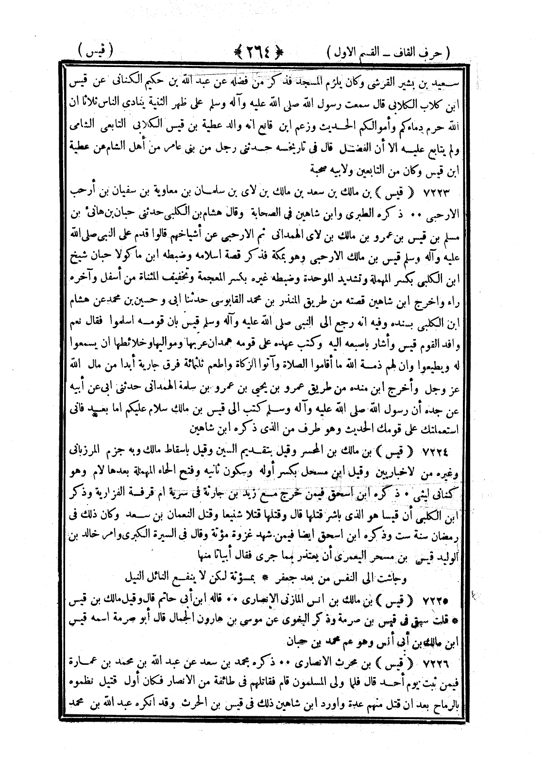 <264> سعيد بن بشير القرشي وكان يلزم المسجد فذكر من فضله عن عبد الله بن حكيم الكناني عن قيس بن كلاب قال سمعت رسول الله صلى الله عليه وسلم على ظهر الثنية ينادي الناس ثلاثا ان الله حرم دماءكم واموالكم الحديث وزعم بن قانع انه والد عطية بن قيس الكلابي التابعي الشامي ولم يتابع عليه الا ان الفضل الغلابي قال في تاريخه حدثني رجل من بني عامر من أهل الشام عن عطية بن قيس وكان من التابعين ولأبيه صحبة قيس بن مالك بن سعد بن مالك بن لاي بن سلمان بن معاوية بن سفيان بن ارحب الارحبي ذكره الطبري وابن شاهين في الصحابة وقال هشام بن الكلبي حدثني حبان بن هانئ بن مسلم بن قيس بن عمرو بن مالك بن لاي الهمداني ثم الارحي عن اشياخهم قالوا قدم على النبي صلى الله عليه وسلم قيس بن مالك الارحبي وهو بمكة فذكر قصة إسلامه وضبط بن ماكولا حبان شيخ بن الكلبي بكسر المهملة وتشديد الموحدة وضبطه غيره بكسر المعجمة وتخفيف المثناة من أسفل وآخره راء وأخرج بن شاهين قصته من طريق المنذر بن محمد القابوسي حدثنا أبي وحسين بن محمد عن هشام الكلبي بسنده وفيه انه رجع الى النبي صلى الله عليه وسلم بان قومه أسلموا فقال نعم وافد القوم قيس وأشار بأصبعه اليه وكتب عهده على قومه همدان عربها ومواليها وخلائطها ان يسمعوا له ويطيعوا وان لهم ذمة الله ما أقاموا الصلاة وآتوا الزكاة واطعم ثلاثمائة فرق جارية ابدا من مال الله عز وجل واخرج بن منده من طريق عمرو بن يحيى عن عمرو بن سلمة الهمداني حدثني أبي عن أبيه عن جده ان رسول الله صلى الله عليه وسلم كتب الى قيس بن مالك سلام عليكم اما بعد فاني استعملتك على قومك الحديث وهو طرف من الذي ذكره بن شاهين قيس بن مالك بن المحسر وقيل بتقديم السين وقيل بإسقاط مالك وبه جزم المرزباني وغيره من الإخباريين وقيل بن مسحل بكسر أوله وسكون ثانية وفتح الحاء المهملة بعدها لام وهو كناني ليثي ذكره بن إسحاق فيمن خرج مع زيد بن حارثة في سرية أم قرفة الفزارية وذكر بن الكلبي ان قيسا هو الذي باشر قتلها قال وقتلها قتلا شنيعا وقتل النعمان بن سعد وكان ذلك في رمضان سنة ست وذكره بن إسحاق أيضا فيمن شهد غزوة مؤتة وقال في السيرة الكبرى وامر خالد بن الوليد قيس بن مسحر اليعمري ان يعتذر مما جرى فقال أبياتا منها وجاشت الى النفس من بعد جعفر بمؤتة لكن لا ينفع النائل النيل قيس بن مالك بن أنس المازني الأنصاري قاله بن أبي حاتم قال وقيل مالك بن قيس قلت سبق في قيس بن صرمة وذكر البغوي عن موسى بن هارون الحمال قال أبو صرمة اسمه قيس بن مالك بن أنس وهو عم محمد بن حيان قيس بن محرث الأنصاري ذكره محمد بن سعد عن عبد الله بن محمد بن عمارة فيمن ثبت يوم أحد قال فلما ولى المسلمون قام فقاتلهم في طائفة من الأنصار فكان أول قتيل نظموه بالرماح بعد ان قتل منهم عدة وأورد بن شاهين ذلك في قيس بن الحارث وقد أنكره عبد الله بن محمد §