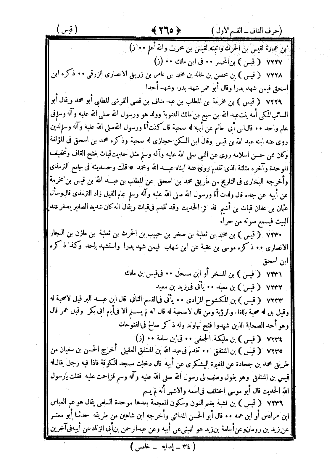 <265> بن عمارة لقيس بن الحارث واثبته لقيس بن محرث والله اعلم قيس بن المحسر في بن مالك قيس بن محصن بن خالد بن مخلد بن عامر بن زريق الأنصاري الزرقي ذكره بن إسحاق فيمن شهد بدرا وقال أبو عمر شهد بدرا وشهد أحدا قيس بن مخرمة بن المطلب بن عبد مناف بن قصي القرشي المطلبي أبو محمد ويقال أبو السائب المكي أمه بنت عبد الله بن سبع بن مالك الغنوي وولد هو ورسول الله صلى الله عليه وسلم في عام واحد قال بن أبي حاتم عن أبيه له صحبة قال كنت انا ورسول الله صلى الله عليه وسلم لدين روى عنه ابنه عبد الله بن قيس وقال بن السكن حجازي له صحبة وذكره محمد بن إسحاق في المؤلفة وكان ممن حسن إسلامه روى عن النبي صلى الله عليه وسلم مثل حديث قباث بفتح القاف وتخفيف الموحدة وآخره مثلثة الذي تقدم روى عنه ابناه عبد الله ومحمد قلت وحديثه في جامع الترمذي وأخرجه البخاري في التاريخ من طريق محمد بن إسحاق عن المطلب بن عبد الله بن قيس بن مخرمة عن أبيه عن جده قال ولدت انا ورسول الله صلى الله عليه وسلم عام الفيل زاد الترمذي قال وسأل عثمان بن عفان قباث بن أشيم فذكر الحديث وقد تقدم في قباث ويقال انه كان شديد الصفير يصفر عند البيت فيسمع صوته من حراء قيس بن مخلد بن ثعلبة بن صخر بن حبيب بن الحارث بن ثعلبة بن مالك بن مازن بن النجار الأنصاري ذكره موسى بن عقبة عن بن شهاب فيمن شهد بدرا واستشهد بأحد وكذا ذكره بن إسحاق قيس بن المسحر أو بن مسحل في قيس بن مالك قيس بن معبد يأتي في يزيد بن معبد قيس بن المكشوح المرادي يأتي في القسم الثاني قال بن عبد البر قيل لا صحبة له وقيل بل له صحبة باللقاء والرؤية ومن قال لا صحبة له قال انه لم يسلم الا في أيام أبي بكر وقيل عمر قال وهو أحد الصحابة الذين شهدوا فتح نهاوند وله ذكر صالح في الفتوحات قيس بن مليكة الجعفي في بن سلمة قيس بن المنتفق تقدم في عبد الله بن المنتفق العقيلي اخرج الحسن بن سفيان من طريق محمد بن جحادة عن المغيرة اليشكري عن أبيه قال دخلت مسجد الكوفة فإذا فيه رجل يقال له قيس بن المنتفق وهو يقول وصف لي رسول الله صلى الله عليه وسلم فزاحمت عليه فقلت يا رسول الله الحديث قال أبو موسى اختلف في اسمه والاشهر انه لم يسم قيس بن نشبة بضم النون وسكون المعجمة بعدها موحدة السلمي يقال هو عم العباس بن مرداس أو بن عمه قال أبو الحسن المدائني وأخرجه بن شاهين من طريقه حدثنا أبو معشر عن يزيد بن رومان عن أسامة بن زيد هو الليثي عن أبيه وعن عبد الرحمن بن أبي الزناد عن أبيه في آخرين §