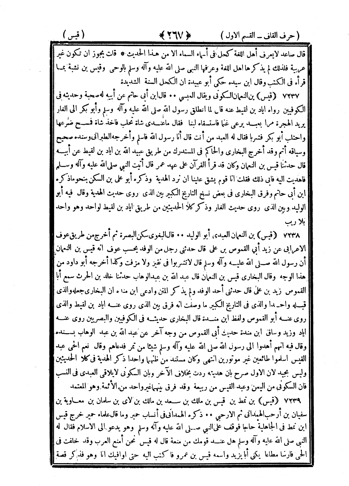 <267> قال صاعد لا يعرف أهل اللغة كحل في أسماء السماء الا من هذا الحديث قلت يجوز ان تكون غير عربية فلذلك لم يذكرها أهل اللغة وعرفها النبي صلى الله عليه وسلم بالوحي وقيس بن نشبة بما قرأه في الكتب وقال بن سيده حكى أبو عبيدة ان الكحل السنة الشديدة قيس بن النعمان السكوني ويقال العبسي قال بن أبي حاتم عن أبيه له صحبة وحديثه في الكوفيين رواه اياد بن لقيط عنه قال لما انطلق رسول الله صلى الله عليه وسلم وأبو بكر الى الغار يريد ان الهجرة مرا بعبد يرعى غنما فاستسقياه لبنا فقال ما عندي شاة تحلب فأخذ شاة فمسح ضرعها واحتلب أبو بكر فشربا فقال له العبد من أنت قال انا رسول الله فاسلم وأخرجه الطبراني وسنده صحيح وسياقه أتم وقد اخرج البخاري والحاكم في المستدرك من طريق عبيد الله بن اياد بن لقيط عن أبيه قال حدثنا قيس بن النعمان وكان قد قرأ القرآن على عهد عمر قال أتيت النبي صلى الله عليه وسلم فاهديت اليه فأبي ذلك فقلت انا قوم يشق علينا ان ترد الهدية وذكره أبو علي بن السكن بنحو ما ذكره بن أبي حاتم وفرق البخاري في بعض نسخ التاريخ الكبير بين الذي روى حديث الهدية وقال فيه أبو الوليد وبين الذي روى حديث الغار وذكر كلا الحديثين من طريق أيام بن لقيط لواحد وهو واحد بلا ريب قيس بن النعمان العبدي أبو الوليد قال البغوي سكن البصرة ثم اخرج من طريق عوف الأعرابي عن زيد أبي القموص بن علي قال حدثني رجل من الوفد يحسب عوف انه قيس بن النعمان ان رسول الله صلى الله عليه وسلم قال لا تشربوا في نقير ولا مزفت وكذا أخرجه أبو داود من هذا الوجه وقال البخاري قيس بن النعمان قال عبد الله بن عبد الوهاب حدثنا خالد بن الحارث سمع أبا القموص زيد بن علي قال حدثني أحد الوفد ولم يذكر المتن وادعى بن منده ان البخاري جعله والذي قبله واحدا والذي في التاريخ الكبير ما وصفت انه فرق بين الذي روى عنه اياد بن لقيط والذي روى عنه أبو القموص ولفظ بن منده قال البخاري حديثه في الكوفيين والبصريين روى عنه اياد وزيد وساق بن منده حديث أبي القموص من وجه آخر عن عبد الله بن عبد الوهاب بسنده وقال فيه انهم اهدوا الى رسول الله صلى الله عليه وسلم شيئا من تمر فدعاهم وقال نعم الحي عبد القيس أسلموا طائعين غير موتورين انتهى وكان مستند من ظنهما واحدا ذكر الهدية في كلا الحديثين وليس بجيد لان الأول صرح بان هديته ردت بخلاف الآخر وبأن السكوني من اليمن وعبد القيس من ربيعة وقد فرق بينهما غير واحد من الأئمة وهو المعتمد قيس بن نمط بن قيس بن مالك بن سعد بن مالك بن لأي بن سلمان بن معاوية بن سفيان بن ارحب الهمداني ثم الارحبي ذكره الهمداني في انساب حمير وما قال علماء حمير خرج قيس بن نمط في الجاهلية حاجا فوقف على النبي صلى الله عليه وسلم وهو يدعو الى الإسلام فقال له النبي صلى الله عليه وسلم هل عند قومك من منعة قال له قيس نحن امنع العرب وقد خلفت في الحي فارسا مطاعا يكنى أبا يزيد واسمه قيس بن عمرو فاكتب اليه حتى اوافيك انا وهو فذكر قصة §