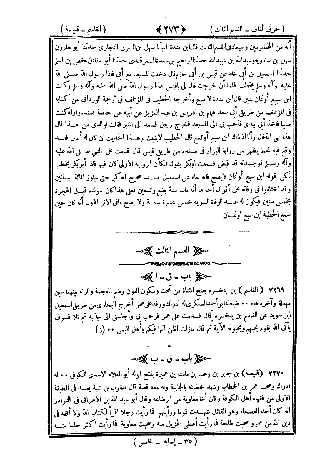 <273> انه من المخضرمين وسيعاد في القسم الثالث قال بن منده أنبأنا سهل بن السري النجاري حدثنا أبو هارون سهل بن شادويه وعبد الله بن عبيد الله حدثنا إبراهيم بن سعد السمرقندي حدثنا أبو مقاتل حفص بن اسلم حدثنا إسماعيل بن أبي خالد عن قيس بن أبي حازم قال دخلت المسجد مع أبي فإذا رسول الله صلى الله عليه وسلم يخطب فلما ان خرجت قال لي يا قيس هذا رسول الله صلى الله عليه وسلم وكنت بن سبع أو ثمان سنين قال بن منده لا يصح وأخرجه الخطيب في المؤتلف في ترجمة الورداني من كتابه في المؤتلف من طريق أبي سعد همام بن إدريس بن عبد العزيز عن أبيه عن حفصة بسنده وأوله كنت صبيا فأخذ أبي بيدي فذهب بي الى المسجد فخرج رجل فصعد الى المنبر فقلت لوالدي من هذا قال هذا نبي الله قال وانا إذ ذاك بن سبع أو تسع قال الخطيب لا يثبت وهذا الحديث ان كان له أصل فقد وقع فيه غلط يظهر من رواية البزار في مسنده من طريق قيس قال قدمت على النبي صلى الله عليه وسلم فوجدته حين قبض فسمعت أبا بكر يقول فكأن الرواية الأولى كان فيها فإذا أبو بكر يخطب لكن قوله بن سبع أو ثمان لا يصح فإنه جاء عن إسماعيل بسند صحيح انه كبر حتى جاوز المائة بسنتين وقد اختلفوا في وفاته على أقوال أحدها انه مات سنة بضع وتسعين فعلى هذا كان مولده قبل الهجرة بخمس سنين فيكون له عند الوفاة النبوية خمس عشرة سنة ولا يصح ما في الأثر الأول انه كان حين سمع الخطبة بن سبع أو ثمان القسم الثالث القاف بعدها الألف ص القاسم بن ينخسره بفتح المثناة من تحت وسكون النون وضم المعجمة والراء بينهما سين مهملة وآخره هاء ضبطه أبو احمد العسكري له إدراك ووفد على عمر اخرج البخاري من طريق إسماعيل بن سويد عن القاسم بن ينخسره قال قدمت على عمر فرحب بي واجلسني الى جانبه ثم تلا فسوف يأتي الله بقوم يحبهم ويحبونه الآية ثم قال ما زلت اظن انها فيكم يا أهل اليمن القاف بعدها الباء قبيصة بن جابر بن وهب بن مالك بن عميرة بفتح أوله أبو العلاء الأسدي الكوفي له إدراك وصحب عمر بن الخطاب وشهد خطبته بالجابية وله معه قصة قال يعقوب بن شيبة يعد في الطبقة الأولى من فقهاء أهل الكوفة وكان أخا معاوية من الرضاعة وقال أبو عبد الله بن الأعرابي في النوادر انه كان أحد الفصحاء وهو القائل شهدت قوما رأيتهم فما رأيت رجلا اقرأ لكتاب الله ولا افقه في دين الله من عمر وصحبت طلحة فما رأيت أعطى لجزيل منه وصحبت معاوية فما رأيت أكثر حلما منه §