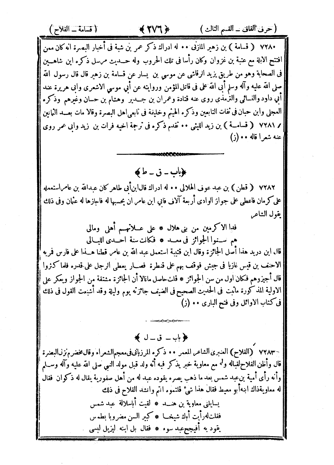 <276> قسامة بن زهير المازني له إدراك ذكر عمر بن شبة في أخبار البصرة انه كان ممن افتتح الأبلة مع عتبة بن غزوان وكان رأسا في تلك الحروب وله حديث مرسل ذكره بن شاهين في الصحابة وهو من طريق يزيد الرقاشي عن موسى بن يسار عن قسامة بن زهير قال قال رسول الله صلى الله عليه وسلم أبى الله على في قاتل المؤمن وروايته عن أبي موسى الأشعري وأبي هريرة عند أبي داود والنسائي والترمذي روى عنه قتادة وعمران بن حدير وهشام بن حسان وغيرهم وذكره العجلي وابن حبان في ثقات التابعين وذكره الهيثم وخليفة في تابعي أهل ابصرة وقالا مات بعد الثمانين قسامة بن زيد الليثي تقدم ذكره في ترجمة أخيه فرات بن زيد وان عمر روى عنه شعرا قاله القاف بعدها الطاء قطن بن عبد عوف الهلالي له إدراك قال بن أبي طاهر كان عبد الله بن عامر استعمله على كرمان فاعطى على جواز الوادي أربعة آلاف فأبى بن عامر ان يحسبها له فاجازها له عثمان بن عفان وفي ذلك يقول الشاعر فدى للاكرمين من بني هلال على علاتهم أهلي ومالي هم سنوا الجوائز في معد فكانت سنة إحدى الليالي قال بن دريد هذا أصل الجائزة وقال بن قتيبة استعمل عبد الله بن عامر قطنا هذا على فارس فمر به الأحنف بن قيس غازيا في جيش فوقف بهم على قنطرة فصار يعطي الرجل على قدره فلما كثروا قال اجيزوهم فكان أول من سن الجوائز قلت حاصل ما قالاه ان الجائزة مشتقة من الجواز ويعكر على الاولية المذكورة ما ثبت في الحديث الصحيح في الضيف جائزته يوم وليلة وقد اشبعت القول في ذلك في كتاب الأوائل وفتح الباري القاف بعدها اللام القلاخ العنبري الشاعر المعمر ذكره المرزباني في معجم الشعراء وقال مخضرم نزل البصرة قال وأظن القلاخ لقبا له وله مع معاوية خبر يذكر فيه انه ولد قبل مولد النبي صلى الله عليه وسلم وانه رأى أمية بن عبد شمس بعدما ذهب بصرة يقوده عبدله من أهل صفورية يقال له ذكوان فقال له معاوية ذاك ابنه أبو معيط فقال هذا شيء قلتموه أنتم وأنشد القلاخ في ذلك يسائلني معاوية بن هند لقيت أبا سلالة عبد شمس فقلت له رأيت أباك شيخا كبير السن مضروبا بطمس يقود به افيحج عبد سوء فقال بل ابنه ليزيل لبسى §