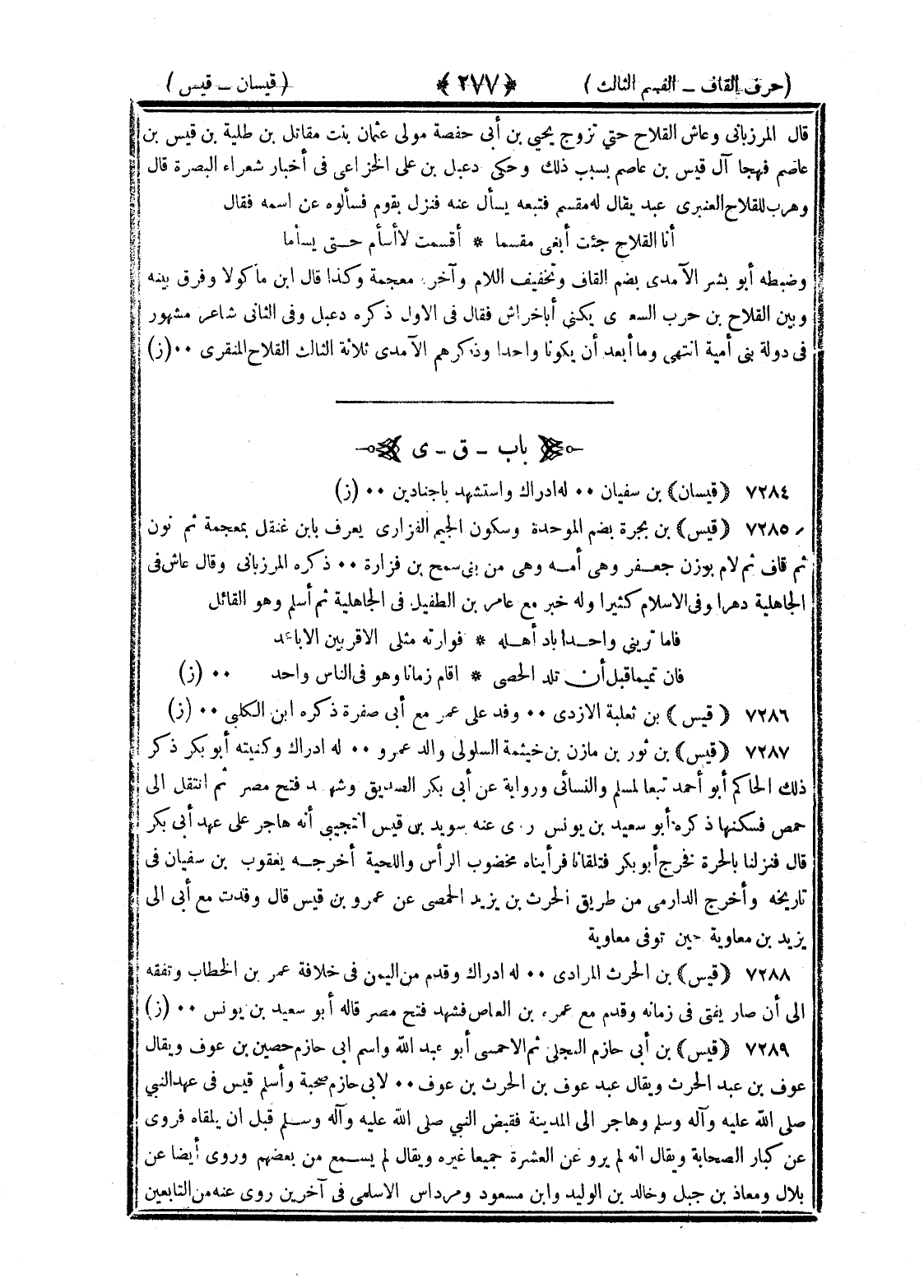 <277> قال المرزباني وعاش القلاخ حتى تزوج يحيى بن أبي حفصة مولى عثمان بنت مقاتل بن طلبة بن قيس بن عاصم فهجا آل قيس بن عاصم بسبب ذلك وحكى دعبل بن علي الخزاعي في أخبار شعراء البصرة قال وهرب للقلاخ العنبري عبد يقال له مقسم فتبعه يسأل عنه فنزل بقوم فسألوه عن اسمه فقال انا القلاخ جئت ابغي مقسما اقسمت لا اسأم حتى يسأما وضبطه أبو بشر الآمدي بضم القاف وتخفيف اللام وآخره معجمة وكذا قال بن ماكولا وفرق بينه وبين القلاخ بن حزن السعدي يكنى أبا خراش فقال في الأول ذكره دعبل وفي الثاني شاعر مشهور في دولة بني أمية انتهى وما ابعد ان يكونا واحدا وذكرهم الآمدي ثلاثة الثالث القلاخ المنقري القاف بعدها الياء قيسان بن سفيان له إدراك واستشهد بأجنادين قيس بن بجرة بضم الموحدة وسكون الجيم الفزاري يعرف بابن غنقل بمعجمة ثم نون ثم قاف ثم لام بوزن جعفر وهي أمه وهي من بني شمخ بن فزارة ذكره المرزباني وقال عاش في الجاهلية دهرا وفي الإسلام كثيرا وله خبر مع عامر بن الطفيل في الجاهلية ثم اسلم وهو القائل فاما تريني واحدا باد أهله توارثه م الأقربين الاباعد فان تميما قبل ان تلبد الحصى أقام زمانا وهو في الناس واحد قيس بن ثعلبة الأزدي وفد على عمر مع أبي صفرة ذكره بن الكلبي قيس بن ثور بن مازن بن خيثمة السلولي والد عمرو له إدراك وكنيته أبو بكر ذكر ذلك الحاكم أبو احمد تبعا لمسلم والنسائي وله رواية عن أبي بكر الصديق وشهد فتح مصر ثم انتقل الى حمص فسكنها ذكره أبو سعيد بن يونس روى عنه سويد بن قيس التجيبي انه هاجر على عهد أبي بكر قال فنزلنا بالحرة فخرج أبو بكر فتلقانا فرأيناه مخضوب الرأس واللحية أخرجه يعقوب بن سفيان في تاريخه وأخرجه الدارمي من طريق الحارث بن يزيد الحمصي عن عمرو بن قيس قال وفدت مع أبي الى يزيد بن معاوية حين توفي معاوية قيس بن الحارث المرادي له إدراك وقدم من اليمن في خلافة عمر بن الخطاب وتفقه الى ان صار يفتى في زمانه وقدم مع عمرو بن العاص فشهد فتح مصر قاله أبو سعيد بن يونس قيس بن أبي حازم البجلي ثم الأحمسي أبو عبد الله واسم أبي حازم حصين بن عوف ويقال عوف بن عبد الحارث ويقال عبد عوف بن الحارث بن عوف لأبي حازم صحبة واسلم قيس في عهد النبي صلى الله عليه وسلم وهاجر الى المدينة فقبض النبي صلى الله عليه وسلم قبل ان يلقاه فروى عن كبار الصحابة ويقال انه لم يرو عن العشرة جميعا غيره ويقال لم يسمع من بعضهم وروى أيضا عن بلال ومعاذ بن جبل وخالد بن الوليد وابن مسعود ومرداس الأسلمي في آخرين روى عنه من التابعين §