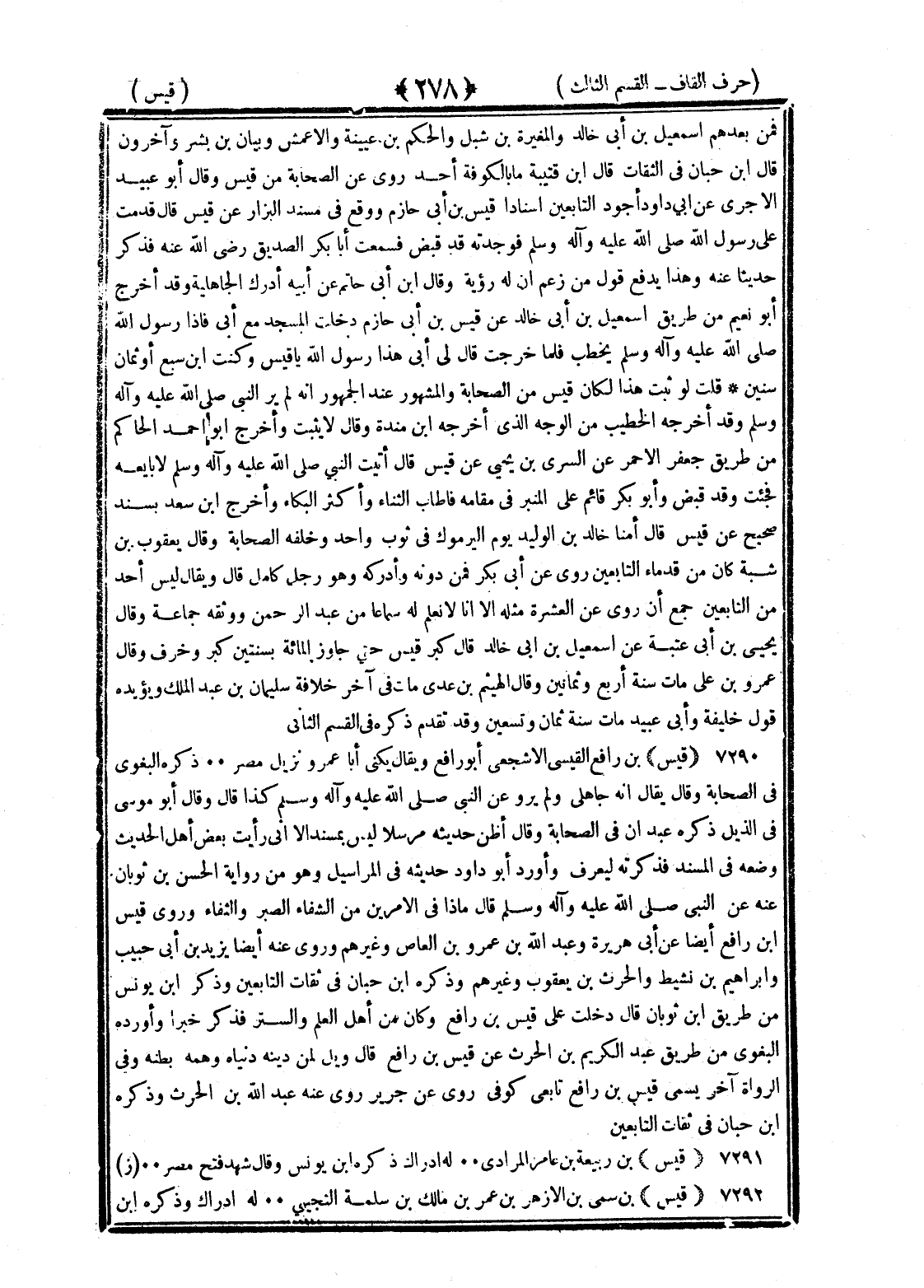 <278> فمن بعدهم إسماعيل بن أبي خالد والمغيرة بن شبل والحكم بن عتيبة والأعمش وبيان بن بشر وآخرون قال بن حبان في الثقات قال بن قتيبة ما بالكوفة أحد أروى عن الصحابة من قيس وقال أبو عبيد الآجري عن أبي داود أجود التابعين إسنادا قيس بن أبي حازم ووقع مسند البزار عن قيس قال قدمت على رسول الله صلى الله عليه وسلم فوجدته قد قبض فسمعت أبا بكر الصديق رضي الله عنه فذكر حديثا عنه وهذا يدفع قول من زعم ان له رؤية وقال بن أبي حاتم عن أبيه أدرك الجاهلية وقد اخرج أبو نعيم من طريق إسماعيل بن أبي خالد عن قيس بن أبي حازم دخلت المسجد مع أبي فإذا رسول الله صلى الله عليه وسلم يخطب فلما خرجت قال لي أبي هذا رسول الله يا قيس وكنت بن سبع أو ثمان سنين قلت لو ثبت هذا لكان قيس من الصحابة والمشهور عند الجمهور انه لم ير النبي صلى الله عليه وسلم وقد أخرجه الخطيب من الوجه الذي أخرجه بن منده وقال لا يثبت واخرج أبو احمد الحاكم من طريق جعفر الأحمر عن السري بن يحيى عن قيس قال أتيت النبي صلى الله عليه وسلم لأبايعه فجئت وقد قبض وأبو بكر قائم على المنبر في مقامه فاطاب الثناء وأكثر البكاء واخرج بن سعد بسند صحيح عن قيس قال امنا خالد بن الوليد يوم اليرموك في ثوب واحد وخلفه الصحابة وقال يعقوب بن شيبة كان من قدماء التابعين روى عن أبي بكر فمن دونه وادركه وهو رجل كامل قال ويقال ليس أحد من التابعين جمع ان روى عن العشرة مثله الا انا لا نعلم له سماعا من عبد الرحمن ووثقه جماعة وقال يحيى بن أبي عتبة عن إسماعيل بن أبي خالد قال كبر قيس حتى جاوز المائة بسنتين كبر وخرف قال عمرو بن علي مات سنة أربع وثمانين وقال الهيثم بن عدي مات في آخر خلافة سليمان بن عبد الملك ويؤيده قول خليفة وأبي عبيد مات سنة ثمان وتسعين وقد تقدم ذكره في القسم الثاني قيس بن رافع القيسي الأشجعي أبو رافع ويقال يكنى أبا عمرو نزيل مصر ذكره البغوي في الصحابة وقال يقال انه جاهلي ولم يرو عن النبي صلى الله عليه وسلم كذا قال وقال أبو موسى في الذيل ذكره عبدان في الصحابة وقال اظن حديثه مرسلا ليس بمسند الا اني رأيت بعض أهل الحديث وضعه في المسند فذكرته ليعرف وأورد أبو داود حديثه في المراسيل وهو من رواية الحسن بن ثوبان عنه عن النبي صلى الله عليه وسلم قال ماذا في الأمرين من الشفاء الصبر والتقى وروى قيس بن رافع أيضا عن أبي هريرة وعبد الله بن عمرو بن العاص وغيرهم وروى عنه أيضا يزيد بن أبي حبيب وإبراهيم بن نشيط والحارث بن يعقوب وغيرهم وذكره بن حبان في ثقات التابعين وذكر بن يونس من طريق بن ثوبان قال دخلت على قيس بن رافع وكان من أهل العلم والسير فذكر خبرا وأورده البغوي من طريق عبد الكريم بن الحارث عن قيس بن رافع قال ويل لمن دينه دنياه وهمه بطنه وفي الرواة آخر يسمى قيس بن رافع تابعي كوفي روى عن جرير روى عنه عبد الله بن الحارث وذكره بن حبان في ثقات التابعين قيس بن ربيعة بن عامر المرادي له إدراك ذكره بن يونس وقال شهد فتح مصر قيس بن سمي بن الأزهر بن عمر بن مالك بن سلمة التجيبي له إدراك وذكره بن §