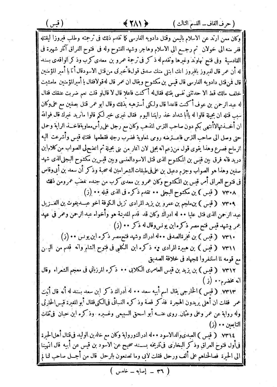<281> وكان ممن ارتد عن الإسلام باليمن وقتل داذويه الفارسي كما تقدم ذلك في ترجمته وطلب فيروز ليقتله ففر منه الى خولان ثم راجع الإسلام وهاجر وشهد الفتوح وله في فتوح العراق آثار شهيرة في القادسية وفي فتح نهاوند وغيرها وتقدم له ذكر في ترجمة عمرو بن معد يكرب وذكر الواقدي بسند له أن عمر قال لفيروز يا فيروز انك ابتلى منك صدق قول فأخبرني من قتل الأسود قال انا يا أمير المؤمنين قال فمن قتل داذويه الفارسي قال قيس بن مكشوح ويقال ان عمر قال له قولا فقال يا أمير المؤمنين ما مشيت خلف ملك قط الا حدثتني نفسي بقتله فقال له عمر أكنت فاعلا قال لا قال لو قلت نعم ضربت عنقك فقال له عبد الرحمن بن عوف أكنت فاعلا قال لا ولكني استرهبه بذلك وقال أبو عمر قتل بصفين مع على وكان سبب قتله ان بجيلة قالوا له يا أبا شداد خذ رايتنا اليوم فقال غيري خير لكم قالوا ما نريد غيرك قال فوالله ان أخذتها لا انتهي بكم دون صاحب الترس المذهب وكان مع رجل على رأس معاوية فأخذا الراية وحمل حتى وصل الى صاحب الترس فاعترضه رومي لمعاوية فضرب رجله فقطعها فقتله قيس وإشرعت إليه الرماح فصرع وهذا يقوي قول من زعم انه بجلي لان أنمار من بني بجيلة ثم اتضح لي الصواب من كلام بن دريد فإنه فرق بين قيس بن المكشوح الذي قتل الأسود العنسي وبين قيس بن مكشوح البجلي الذي شهد صفين وهذا هو الصواب وجزم دعبل بن علي في طبقات الشعراء بأن له صحبه وذكر أن سعد بن أبي وقاص في فتوح العراق أمر قيس بن المكشوح وكان عمرو بن معد يكرب من جنده فغضب عمرو من ذلك قيس بن مكشوح البجلي تقدم ذكره في الذي قبله قيس بن ملجم بن عمرو بن يزيد المرادي نزيل الكوفة أخو عبد الرحمن الذي قتل عليا له إدراك وكان قد قدم المدينة هو وأخوه عبد الرحمن وعمر في عهد عمر وشهد قيس فتح مصر ذكره بن يونس وقال له ذكر قيس بن نخرة الصدفي له إدراك وشهد فتح مصر ذكره بن يونس قيس بن هبيرة المرادي ذكره بن الكلبي في فتوح الشام وانه قدم من اليمن مع قومه لما استنفروا للجهاد في خلافة الصديق قيس بن يزيد بن قيس العامري الكلابي ذكره المرزباني في معجم الشعراء وقال انه مخضرم قيس الخارجي يقال اسم أبيه سعد له إدراك ذكر بن سعد بسند له انه قال أتيت عمر فقلت ان أهلي يريدون الهجرة فذكر قصة وذكره النسائي في الكنى فقال أبو المغيرة قيس الخارجي وله رواية عن عمر وعلي وعثمان روى عنه أبو إسحاق السبيعي وغيره وذكره بن حبان في ثقات التابعين قيس العبدي والد الأسود له إدراك ورواية وكان مع خالد بن الوليد في قتال أهل الحيرة في أول فتوح العراق وذكر البخاري في تاريخه بسند صحيح عن الأسود بن قيس عن أبيه قال انهينا الى الحيرة فصالحناهم على ألف ورحل فقلت لأبي وما تصنعون بالرحل قال من أجل صاحب لنا لم §