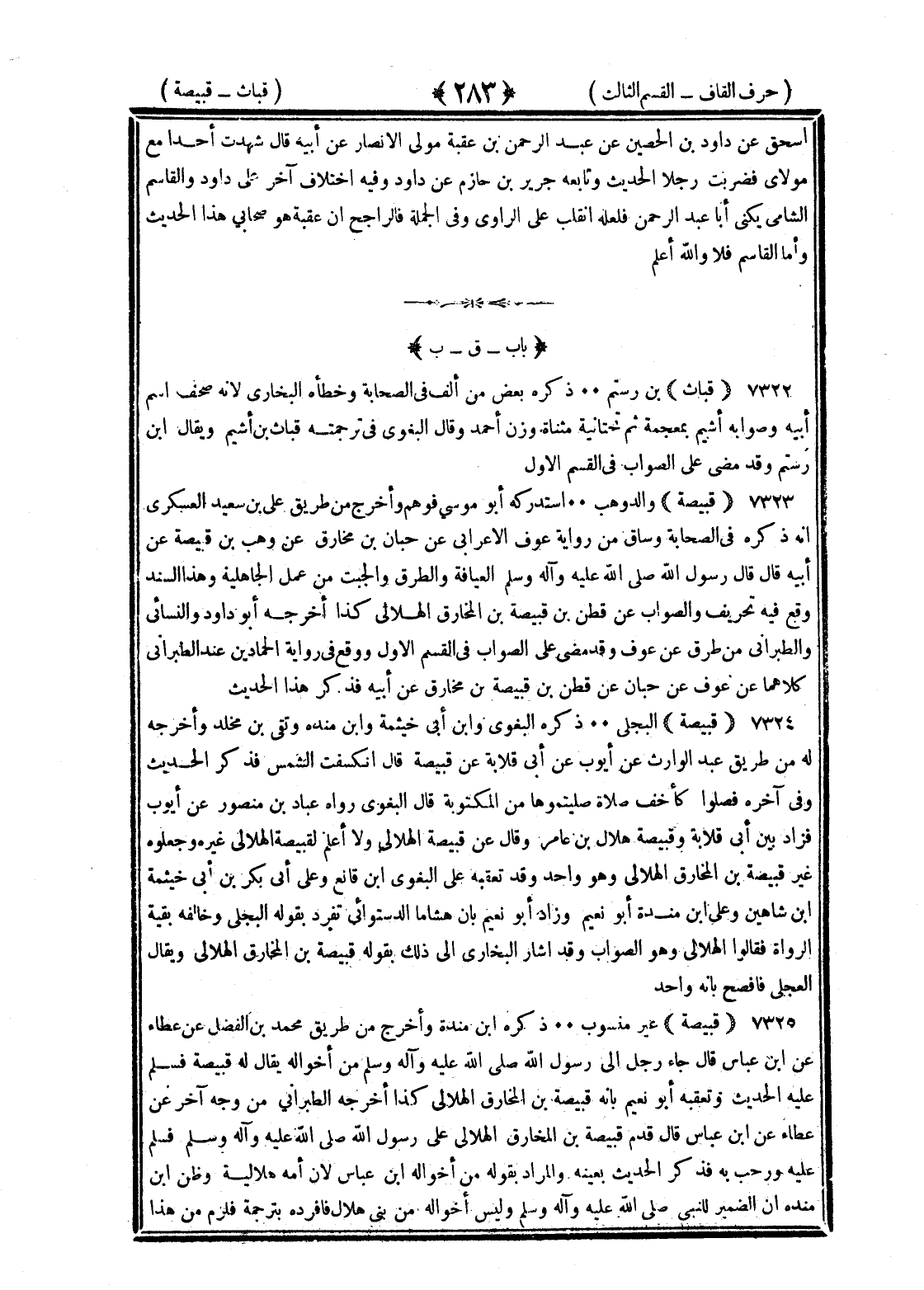 <283> إسحاق وروى عن داود بن الحصين عن عبد الرحمن بن عقبة مولى الأنصار عن أبيه قال شهدت أحدا مع مولاي فضربت رجلا الحديث وتابعه جرير بن حازم عن داود وفيه اختلاف آخر على داود والقاسم الشامي يكنى أبا عبد الرحمن فلعله انقلب على الراوي وفي الجملة فالراجح ان عقبة هو صحابي هذا الحديث واما القاسم فلا والله اعلم القاف بعدها الباء قباث بن رستم ذكره بعض من ألف في الصحابة وخطأه البخاري لأنه صحف اسم أبيه وصوابه أشيم بمعجمة ثم تحتانية مثناة وزن احمد وقال البغوي في ترجمة قباث بن أشيم ويقال بن رستم وقد مضى على الصواب في القسم الأول قبيصة والد وهب استدركه أبو موسى فوهم واخرج من طريق علي بن سعيد العسكري انه ذكره في الصحابة وساق من رواية عوف الأعرابي عن حبان بن مخارق عن وهب بن قبيصة عن أبيه قال قال رسول الله صلى الله عليه وسلم العيافة والطرق والجبت من عمل الجاهلية وهذا السند وقع فيه تحريف والصواب عن قطن بن قبيصة بن المخارق الهلالي كذا أخرجه أبو داود والنسائي والطبراني من طرق عن عوف وقد مضى على الصواب في القسم الأول ووقع في رواية الحمادين عند الطبراني كلاهما عن عوف عن حبان عن قطن بن قبيصة بن مخارق عن أبيه فذكر هذا الحديث قبيصة البجلي ذكره البغوي وابن أبي خيثمة وابن منده وبقى بن مخلد واخرجوا له من طريق عبد الوارث عن أيوب عن أبي قلابة عن قبيصة قال انكسفت الشمس فذكر الحديث وفي آخره فصلوا كأخف صلاة صليتموها من المكتوبة قال البغوي رواه عباد بن منصور عن أيوب فزاد بين أبي قلابة وقبيصة هلال بن عامر وقال عن قبيص الهلالي ولا اعلم لقبيصة الهلالي غيره وجعلوه غير قبيصة بن المخارق الهلالي وهو واحد وقد تعقبه على البغوي بن قانع وعلى أبي بكر بن أبي خيثمة بن شاهين وعلى بن منده أبو نعيم وزاد أبو نعيم بان هشاما الدستوائي تفرد بقوله البجلي وخالفه بقية الرواة فقالوا الهلالي وهو الصواب وقد أشار البخاري الى ذلك بقوله قبيصة بن المخارق الهلالي ويقال البجلي فأفصح بأنه واحد قبيصة غير منسوب ذكره بن منده واخرج من طريق محمد بن الفضل عن عطاء عن بن عباس قال جاء رجل الى رسول الله صلى الله عليه وسلم من أخواله يقال له قبيصة فسلم عليه الحديث وتعقبه أبو نعيم بأنه قبيصة بن المخارق الهلالي كذا أخرجه الطبراني من وجه آخر عن عطاء عن بن عباس قال قدم قبيصة بن المخارق الهلالي على رسول الله صلى الله عليه وسلم فسلم عليه ورحب به فذكر الحديث بعينه والمراد بقوله من أخواله بن عباس لان أمه هلالية وظن بن منده ان الضمير للنبي صلى الله عليه وسلم وليس أخواله من بني هلال فافرده بترجمة فلزم من هذا §