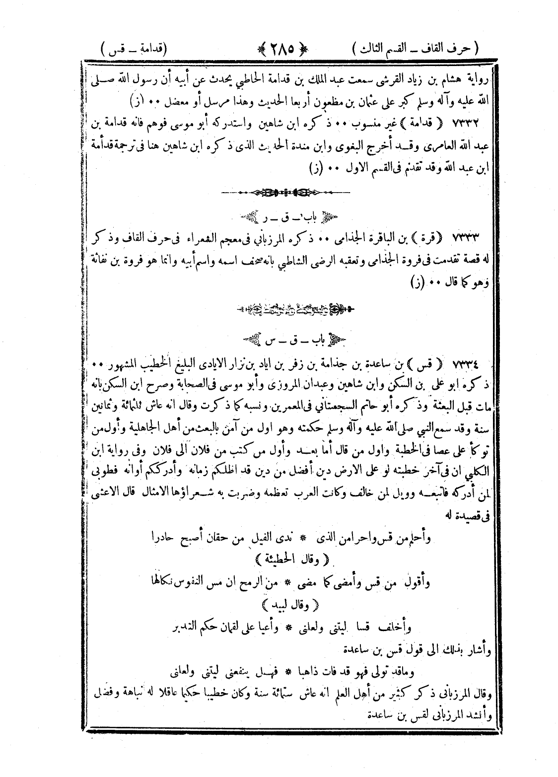 <285> رواية هشام بن زياد القرشي سمعت عبد الملك بن قدامة الحاطبي يحدث عن أبيه ان رسول الله صلى الله عليه وسلم كبر على عثمان بن مظعون أربعا الحديث وهذا مرسل أو معضل قدامة غير منسوب ذكره بن شاهين واستدركه أبو موسى فوهم فإنه قدامة بن عبد الله العامري وقد اخرج البغوي وابن منده الحديث الذي ذكره بن شاهين هنا في ترجمة قدامة بن عبد الله وقد تقدم في القسم الأول القاف بعدها الراء قردة بن الناقرة الجذامي ذكره المرزباني في معجم الشعراء في حرف القاف وذكر له قصة تقدمت في قروة الجذامي وتعقبه الرضى الشاطبي بأنه صحف اسمه واسم أبيه وانما هو فروة بن نفاثة وهو كما قال القاف بعدها السين قس بن ساعدة بن حذافة بن زفر بن اياد بن نزار الايادي البليغ الخطيب المشهور ذكره أبو علي بن السكن وابن شاهين وعبدان المروزي وأبو موسى في الصحابة وصرح بن السكن بأنه مات قبل البعثة وذكره أبو حاتم السجستاني في المعمرين ونسبه كما ذكرت وقال انه عاش ثلاثمائة وثمانين سنة وقد سمع النبي صلى الله عليه وسلم حكمته وهو أول من آمن بالبعث من أهل الجاهلية وأول من توكأ على عصا في الخطبة وأول من قال اما بعد في قول وأول من كتب من فلان الى فلان وفي رواية بن الكلبي ان في آخر خطبته لو على الأرض دين أفضل من دين قد اظلكم زمانه وادرككم أونه انه فطوبى لمن أدركه فاتبعه وويل لمن خالفه وكانت العرب تعظمه وضربت به شعراؤها الأمثال قال الأعشى في قصيدة له واحلم من قس واجرى من الذي بذي الغيل من خفان أصبح حادرا وقال الحطيئة وأقول من قس وامضى كما مضى من الرمح ان مس النفوس نكالها وقال لبيد واخلف قسا ليتني ولعلني وأعيا على لقمان حكم التدبر وأشار بذلك الى قول قس بن ساعدة وما قد تولى فهو قد فات ذاهبا فهل ينفعني ليتني ولعلني وقال المرزباني ذكر كثير من أهل العلم انه عاش ستمائة سنة وكان خطيبا حكيما عاقلا له نباهة وفضل وأنشد المرزباني لقس بن ساعدة حكيما عاقلا له نباهة وفضل وأنشد المرزباني لقس بن ساعدة §