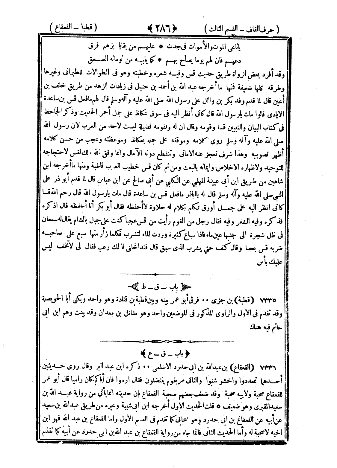 <286> يا ناعي الموت والاموات في جدث عليهم من بقايا بزهم فرق دعهم فان لهم يوما يصاح بهم كما ينبه من نوماته الصعق وقد افرد بعض الرواة طريق حديث قس وفيه شعره وخطبته وهو في المطولات للطبراني وغيرها وطرقه كلها ضعيفة فمنها ما أخرجه عبد الله بن احمد بن حنبل في زيادات الزهد من طريق خلف بن اعين قال لما قدم وفد بكر بن وائل على رسول الله صلى الله عليه وسلم قال لهم ما فعل قس بن ساعدة الايادي قالوا مات يا رسول الله قال كأني أنظر اليه في سوق عكاظ على جمل احمر الحديث وذكر الجاحظ في كتاب البيان والتبيين قسا وقومه وقال ان له ولقومه فضيلة ليست لاحد من العرب لان رسول الله صلى الله عليه وسلم روى كلامه وموقفه على جملة بعكاظ وموعظته وعجب من حسن كلامه واظهر تصويبه وهذا شرف تعجز عنه الأماني وتنقطع دونه الآمال وانما وفق الله ذلك لقس لاحتجاجه للتوحيد ولاظهاره الإخلاص وايمانه بالبعث ومن ثم كان قس خطيب العرب قاطبة ومنها ما أخرجه بن شاهين من طريق بن أبي عيينة المهلبي عن الكلبي عن أبي صالح عن بن عباس قال لما قدم أبو ذر على النبي صلى الله عليه وسلم قال له يا أبا ذر ما فعل قس بن ساعدة قال مات يا رسول الله قال رحم الله قسا كأني انظر اليه على جمل اورق تكلم بكلام له حلاوة لا احفظه فقال أبو بكر انا احفظه قال اذكره فذكره وفيه الشعر وفيه فقال رجل من القوم رأيت من قس عجبا كنت على جبل بالشام يقال له سمعان في ظل شجرة الى جنبها عين ماء فإذا سباع كثيرة وردت الماء لتشرب فكلما زار منها سبع على صاحبه ضربه قس بعصا وقال كف حتى يشرب الذي سبق قال فتداخلني لذلك رعب فقال لي لا تخف ليس عليك بأس القاف بعده الطاء قطبة بن جزي فرق أبو عمر بينه وبين قطبة بن قتادة وهو واحد ويكنى أبا الحويصلة وقد تقدم في الأول والراوي المذكور في الموضعين واحد وهو مقاتل بن معدان وقد بينت وهم بن أبي حاتم فيه هناك القاف بعدها العين القعقاع بن عبد الله بن أبي حدرد الأسلمي ذكره بن عبد البر وقال روى حديثين أحدهما تمعددوا واخشوشنوا والثاني مر بقوم ينتضلون فقال ارموا فان اباكم كان راميا قال أبو عمر للقعقاع صحبة ولأبيه صحبة وقد ضعف بعضهم صحبة القعقاع بان حديثه إنما يأتي من رواية عبد الله بن سعيد المقبري وهو ضعيف قلت الحديث الأول أخرجه بن أبي شيبة وغيره من طريق عبد الله بن سعيد عن أبيه عن القعقاع بن أبي حدرد وهو صحابي كما تقدم في القسم الأول واما القعقاع بن عبد الله فهو بن أخيه لا صحبة له واما الحديث الثاني فانما جاء من رواية القعقاع بن عبد الله بن أبي حدرد عن أبيه كما تقدم §