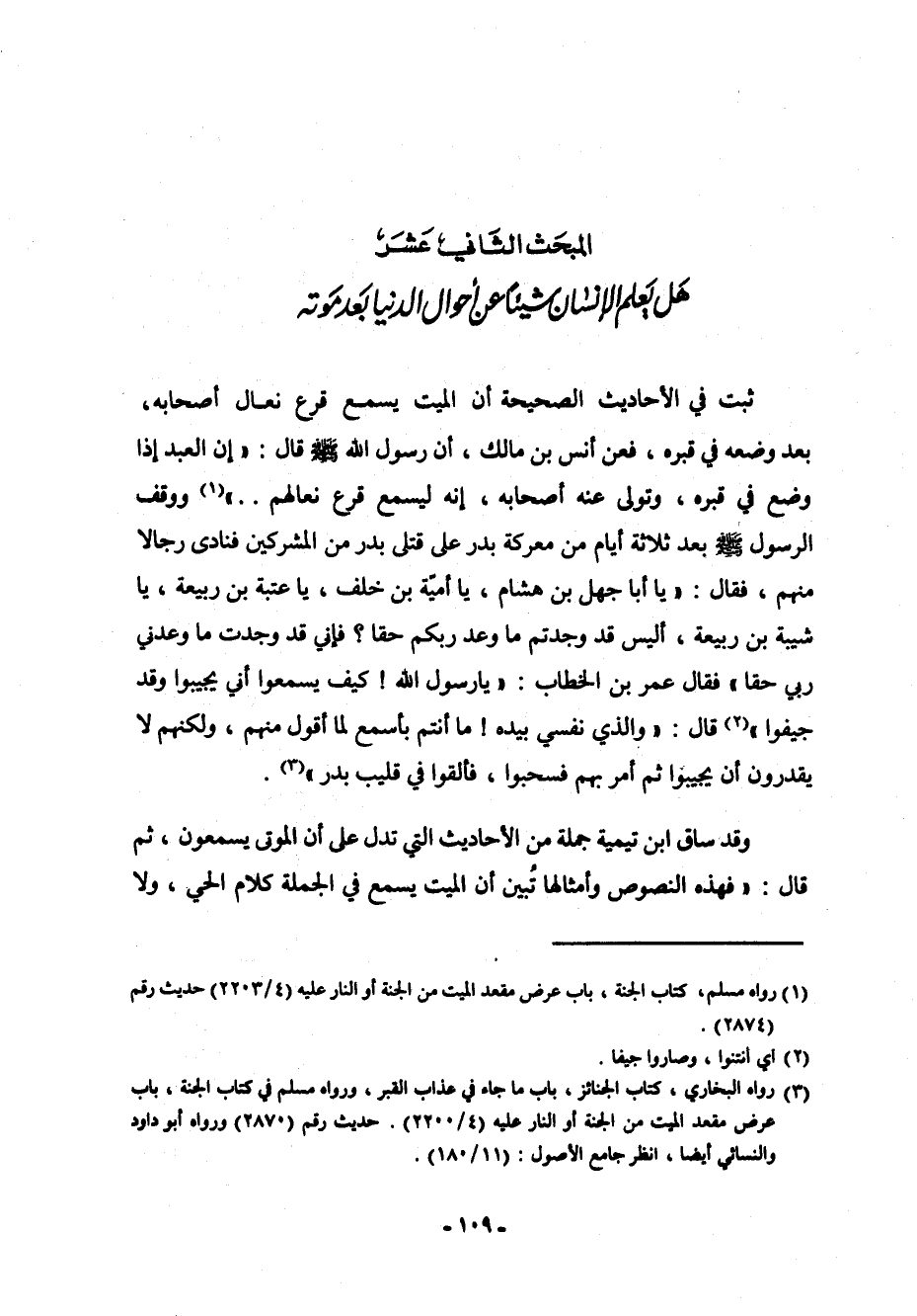 ثبت في الأحاديث الصحيحة أن الميت يسمع قرع نعال أصحابه، بعد وضعه في قبره، حال انصرافهم، فعن أنس بن مالك، أن رسول الله صلى الله عليه وسلم قال: " إن العبد إذا وضع في قبره، وتولى عنه أصحابه، إنه ليسمع قرع نعالهم.. " (¬1) ووقف الرسول صلى الله عليه وسلم بعد ثلاثة أيام من معركة بدر على قتلى بدر من المشركين، فنادى رجالاً منهم، فقال: " يا أبا جهل بن هشام، يا أمية بن خلف، يا عتبة بن ربيعة، يا شيبة بن ربيعة، أليس قد وجدتم ما وعد ربكم حقاً؟ فإني قد وجدت ما وعدني ربي حقاً " فقال عمر بن الخطاب: " يا رسول الله! كيف يسمعوا أنى يجيبوا وقد جيفوا؟! " (¬2) قال: " والذي نفسي بيده! ما أنتم بأسمع لما أقول منهم، ولكنهم لا يقدرون أن يجيبوا، ثم أمر بهم فسحبوا، فألقوا في قليب بدر " (¬3) .