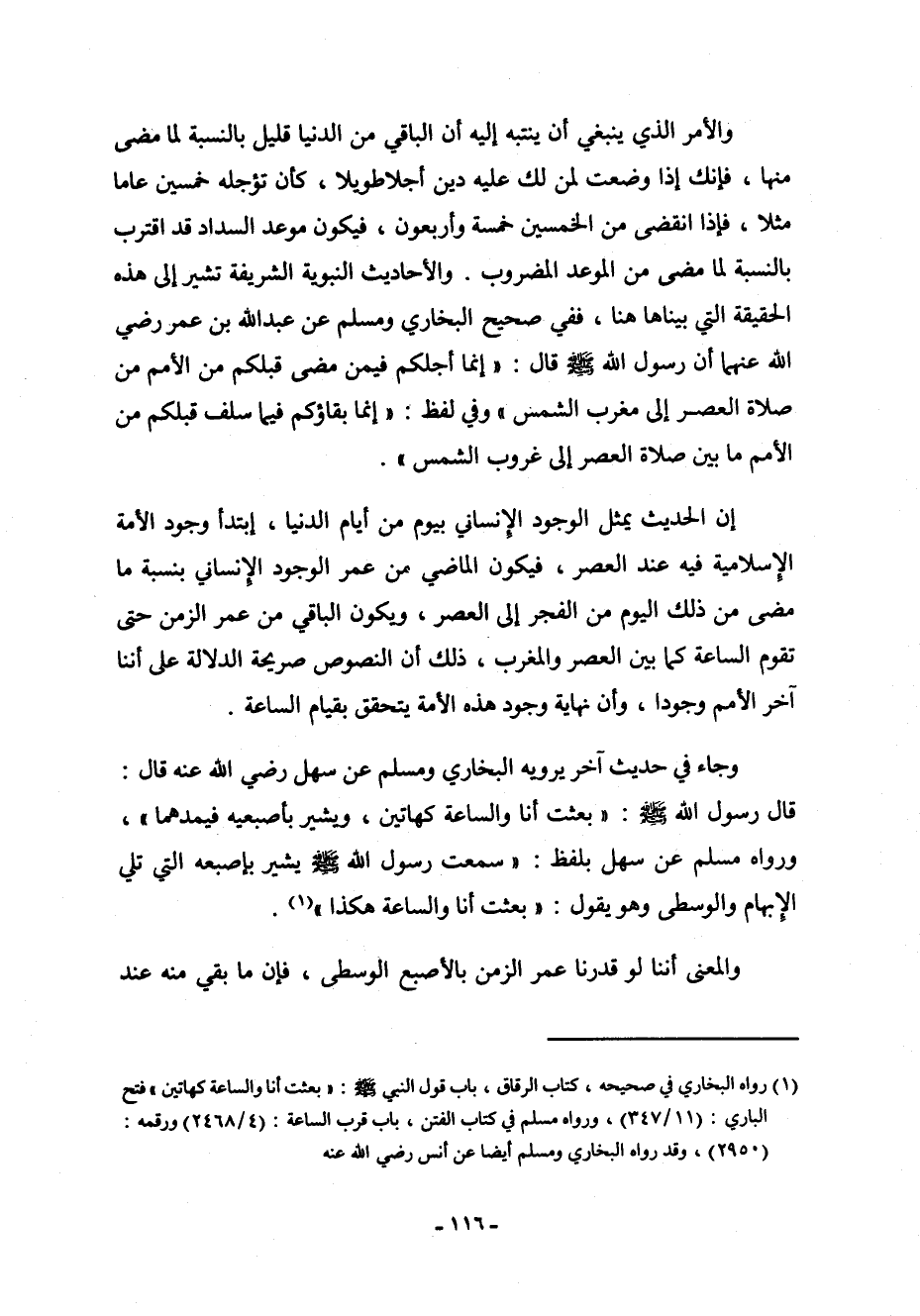 (¬1) رواه البخاري في صحيحه، كتاب الرقاق، باب قول النبي صلى الله عليه وسلم: (بعثت أنا والساعة كهاتين) فتح الباري: (11/347) ، ورواه مسلم في كتاب الفتن، باب قرب الساعة: (4/2468) ورقمه: (2950) ، وقد رواه البخاري ومسلم أيضاً عن أنس رضي الله عنه.