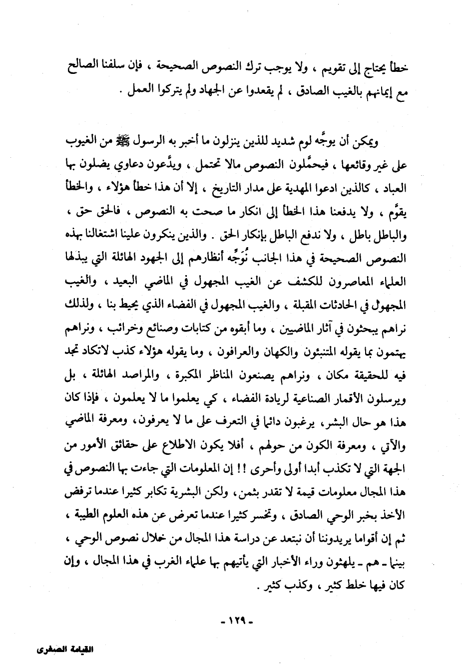 والذين ينكرون علينا اشتغالنا بهذه النصوص الصحيحة في هذا الجانب نُوجِّه أنظارهم إلى الجهود الهائلة التي يبذلها العلماء المعاصرون للكشف عن الغيب المجهول في الماضي البعيد، والغيب المجهول في الحادثات المقبلة، والغيب المجهول في الفضاء الذي يحيط بنا، ولذلك نراهم يبحثون في آثار الماضين، وما أبقوه من كتابات وصنائع وخرائب، ونراهم يهتمون بما يقوله المتنبئون والكهان والعرافون، وما يقوله هؤلاء كذب لا تكاد تجد فيه للحقيقة مكان، ونراهم يصنعون المناظر المكبرة، والمراصد الهائلة، بل ويرسلون الأقمار الصناعية لريادة الفضاء، كي يعلموا ما لا يعلمون، فإذا كان هذا هو حال البشر، يرغبون دائماً في التعرف على ما لا يعرفون، ومعرفة الماضي والآتي، ومعرفة الكون من حولهم، أفلا يكون الإطلاع على حقائق الأمور من الجهة التي لا تكذب أبداً أولى وأحرى!! إن المعلومات التي جاءت بها النصوص في هذا المجال معلومات قيمة لا تقدر بثمن، ولكن البشرية تكابر كثيراً عندما ترفض الأخذ بخبر الوحي الصادق، وتخسر كثيراً عندما تعرض عن هذه العلوم الطيبة، ثم إن أقواماً يريدوننا أن نبتعد عن دارسة هذا المجال من خلال نصوص الوحي، بينما - هم - يلهثون وراء الأخبار التي يأتيهم بها علماء الغرب في هذا المجال، وإن كان فيها خلط كثير، وكذب كثير.