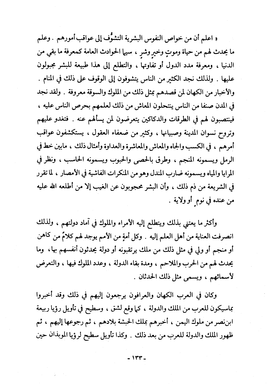 " اعلم أن من خواص النفوس البشرية التشوُّف إلى عواقب أمورهم، وعلم ما يحدث لهم من حياة وموتٍ وخيرٍ وشر، سيما الحوادث العامة كمعرفة ما بقي من الدنيا، ومعرفة مدد الدول أو تفاوتها، والتطلع إلى هذا طبيعة للبشر مجبولون عليها. ولذلك نجد الكثير من الناس يتشوفون إلى الوقوف على ذلك في المنام.