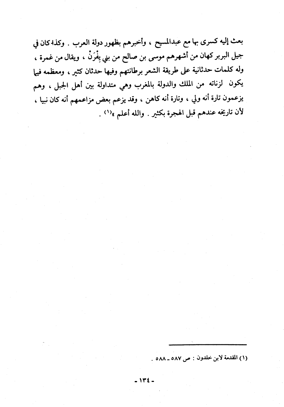 بعث إليه كسرى بها مع عبد المسيح، وأخبرهم بظهور دولة العرب. وكذا كان في جيل البربر كهان من أشهرهم موسى بن صالح من بني يِفْرَنْ، ويقال من غمرة، وله كلمات حدثانية على طريقة الشعر برطانتهم، وفيها حدثان كثير، ومعظمه فيما يكون لزناتة من الملك والدولة بالمغرب، وهي متداولة بين أهل الجبل، وهم يزعمون تارة أنه ولي، وتارة أنه كاهن، وقد يزعم بعض مزاعمهم أنه كان نبياً، لأن تاريخه عندهم قبل الهجرة بكثير. والله أعلم " (¬1) .