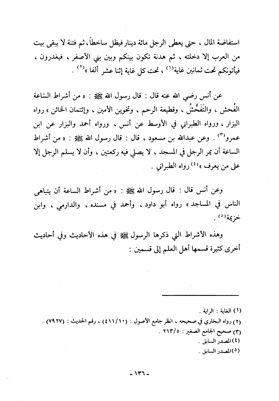 وهذه الأشراط التي ذكرها الرسول صلى الله عليه وسلم في هذه الأحاديث وفي أحاديث أخرى كثيرة قسمها أهل العلم إلى قسمين:
