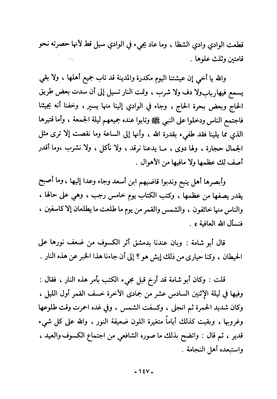 والله يا أخي إن عيشتنا اليوم مكدرة والمدينة قد تاب جميع أهلها، ولا بقي يسمع فيها رباب ولا دف ولا شرب، وتمت النار تسيل إلى أن سدت بعض طريق الحاج وبعض بحرة الحاج، وجاء في الوادي إلينا منهم يسير، وخفنا أنه يجيئنا فاجتمع الناس ودخلوا على النبي صلى الله عليه وسلم وتابوا عنده جميعهم ليلة الجمعة، وأما قتيرها الذي مما يلينا فقد طفئ بقدرة الله، وأنها إلى الساعة وما نقصت إلا ترى مثل الجمال حجارة، ولها دوي، ما يدعنا نرقد، ولا نأكل، ولا نشرب، وما أقدر أصف لك عظمها ولا ما فيها من الأهوال.