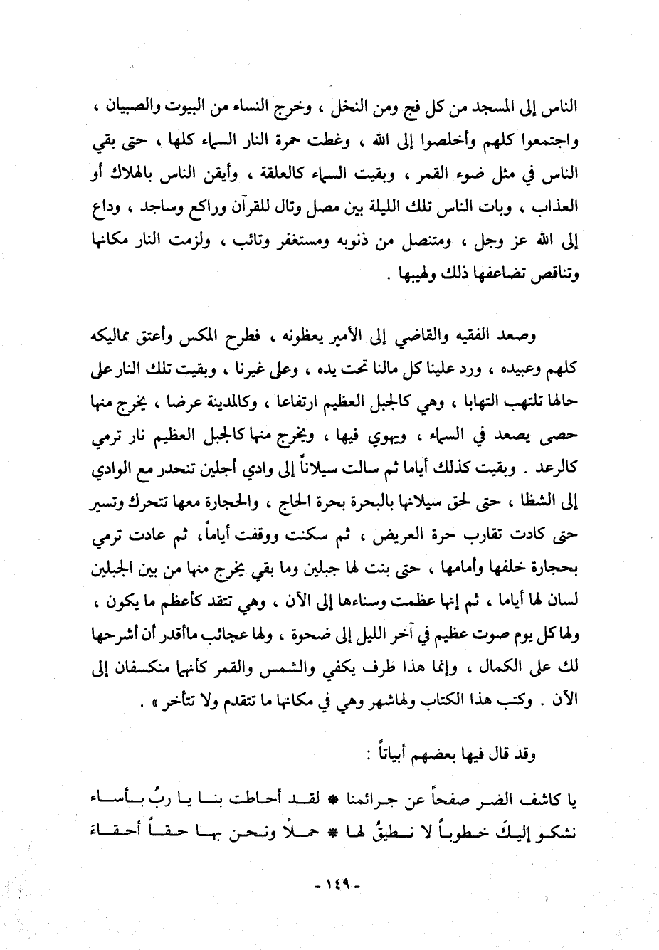 وصعد الفقيه والقاضي إلى الأمير يعظونه، فطرح المكس وأعتق مماليكه كلهم وعبيده، ورد علينا كل مالنا تحت يده، وعلى غيرنا، وبقيت تلك النار على حالها تلتهب التهاباً، وهي كالجبل العظيم ارتفاعاً، وكالمدينة عرضاً، يخرج منها حصى يصعد في السماء، ويهوي فيها، ويخرج منها كالجبل العظيم نار ترمي كالرعد. وبقيت كذلك أياماً ثم سالت سيلاناً إلى وادي أجيلين تنحدر مع الوادي إلى الشظا، حتى لحق سيلانها بالبحرة بحرة الحاج، والحجارة معها تتحرك وتسير حتى كادت تقارب حرة العريض، ثم سكنت ووقفت أياماً، ثم عادت ترمي بحجارة خلفها وأمامها، حتى بنت لها جبلين، وما بقي يخرج منها من بين الجبلين لسان لها أياماً، ثم إنها عظمت وسناءها إلى الآن، وهي تتقد كأعظم ما يكون، ولها كل يوم صوت عظيم في آخر الليل إلى ضحوة، ولها عجائب ما أقدر أن أشرحها لك على الكمال، وإنما هذا طرف يكفي، والشمس والقمر كأنهما منكسفان إلى الآن. وكتب هذا الكتاب ولها شهر وهي في مكانها ما تتقدم ولا تتأخر ".