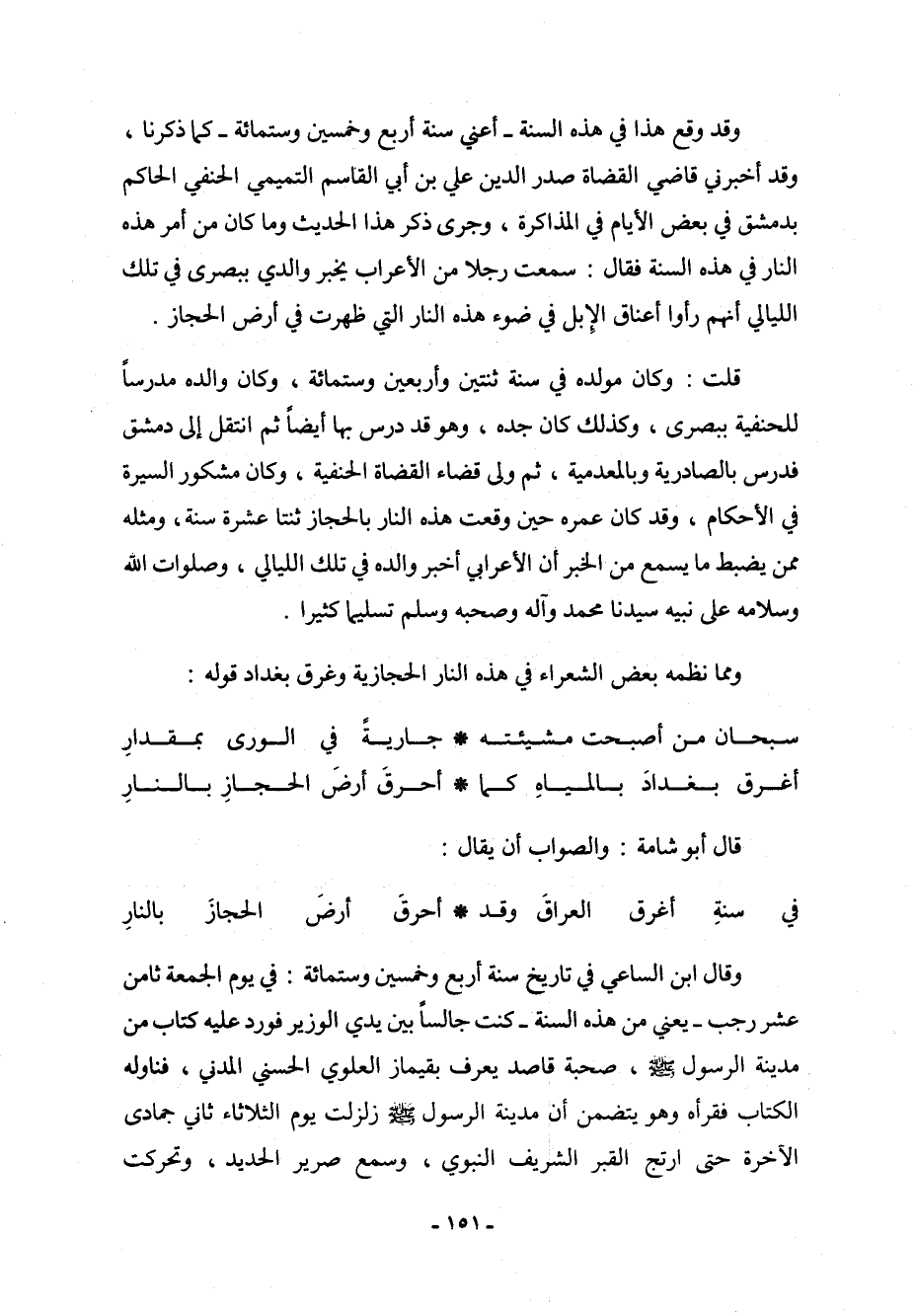 قلت: وكان مولده في سنة ثنتين وأربعين وستمائة، وكان والده مدرساً للحنفية ببصرى، وكذلك كان جده، وهو قد درس بها أيضاً ثم انتقل إلى دمشق فدرس بالصادرية وبالمعدمية، ثم ولى قضاء القضاة الحنفية، وكان مشكور السيرة في الأحكام، وقد كان عمره حين وقعت هذه النار بالحجاز ثنتا عشرة سنة، ومثله ممن يضبط ما يسمع من الخبر أن الأعرابي أخبر والده في تلك الليالي، وصلوات الله وسلامه على نبيه سيدنا محمد وآله وصحبه وسلم تسليماً كثيراً.