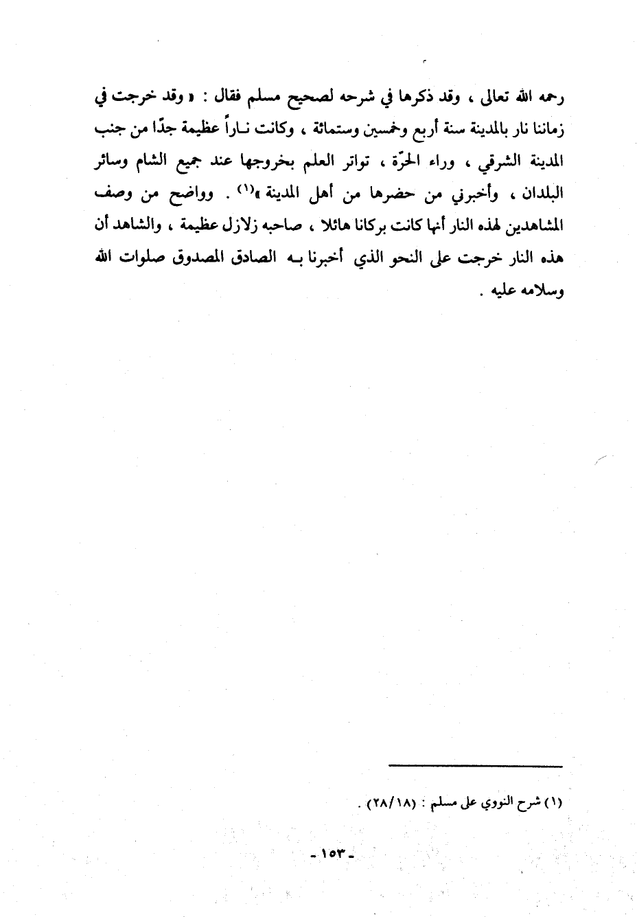 رحمه الله تعالى، وقد ذكرها في شرحه لصحيح مسلم فقال: " وقد خرجت في زماننا نار بالمدينة سنة أربع وخمسين وستمائة، وكانت ناراً عظيمة جداً من جنب المدينة الشرقي، وراء الحرة، تواتر العلم بخروجها عند جميع الشام وسائر البلدان، وأخبرني من حضرها من أهل المدينة " (¬1) . وواضح من وصف المشاهدين لهذه النار أنها كانت بركاناً هائلاً، صاحبه زلازل عظيمة، والشاهد أن هذه النار خرجت على النحو الذي أخبرنا به الصادق المصدوق صلوات الله وسلامه عليه.