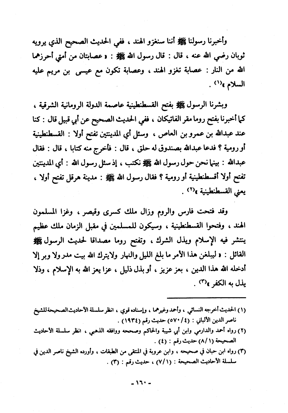 وبشرنا الرسول صلى الله عليه وسلم بفتح القسطنطينية عاصمة الدولة الرومانية الشرقية، كما أخبرنا بفتح روما مقر الفاتيكان، ففي الحديث الصحيح عن أبي قبيل قال: كنا عند عبد الله بن عمرو بن العاص، وسئل أي المدينتين تفتح أولاً: القسطنطينية أو رومية؟ فدعا عبد الله بصندوق له حلق، قال: فأخرج منه كتاباً، قال: فقال عبد الله: بينما نحن حول رسول الله صلى الله عليه وسلم نكتب، إذ سئل رسول الله: أي المدينتين تفتح أولاً أقسطنطينية أو رومية؟ فقال رسول الله صلى الله عليه وسلم: مدينة هرقل تفتح أولاً، يعني القسطنطينية " (¬2) .