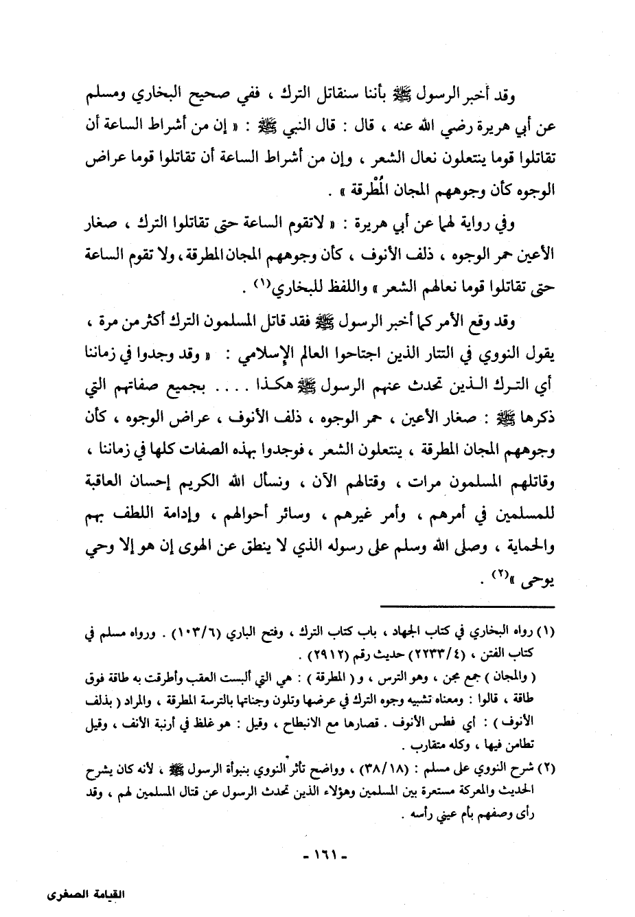 (¬2) شرح النووي على مسلم: (18/38) ، وواضح تأثر النووي بنبوءة الرسول صلى الله عليه وسلم، لأنه كان يشرح الحديث والمعركة مستعرة بين المسلمين وهؤلاء الذين تحدث الرسول عن قتال المسلمين لهم، وقد رأى وصفهم بأم عيني رأسه.