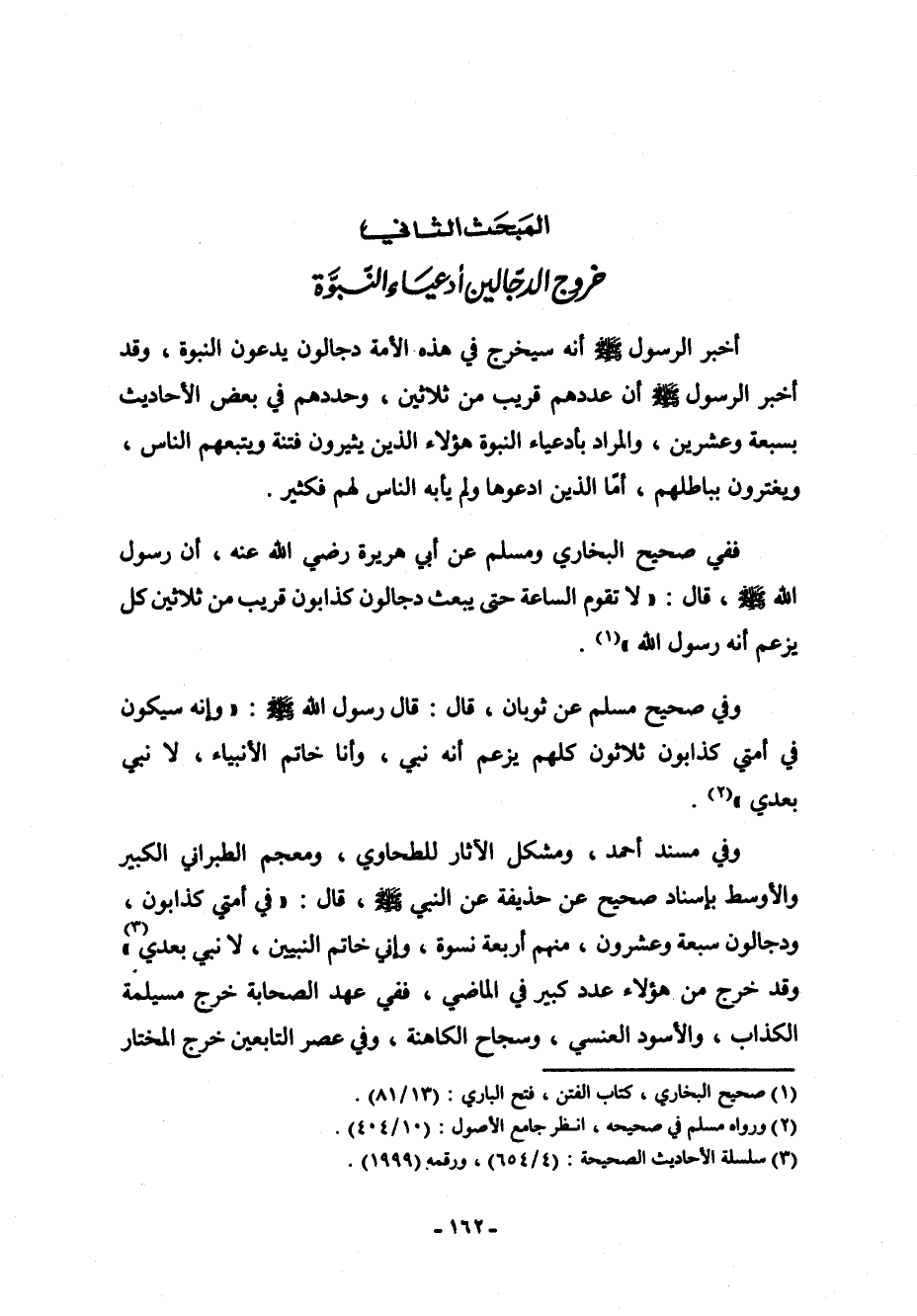 وفي صحيح مسلم عن ثوبان قال: قال رسول الله صلى الله عليه وسلم: " وإنه سيكون في أمتي كذابون ثلاثون كلهم يزعم أنه نبي، وأنا خاتم الأنبياء لا نبي بعدي " (¬2) .