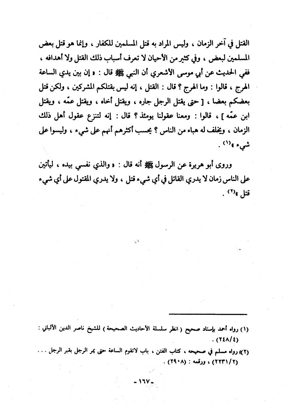 وروى أبو هريرة عن الرسول صلى الله عليه وسلم أنه قال: " والذي نفسي بيده، ليأتين على الناس زمان لا يدري القاتل في أي شيء قَتَل، ولا يدري المقتول على أي شيء قُتِل " (¬2) .