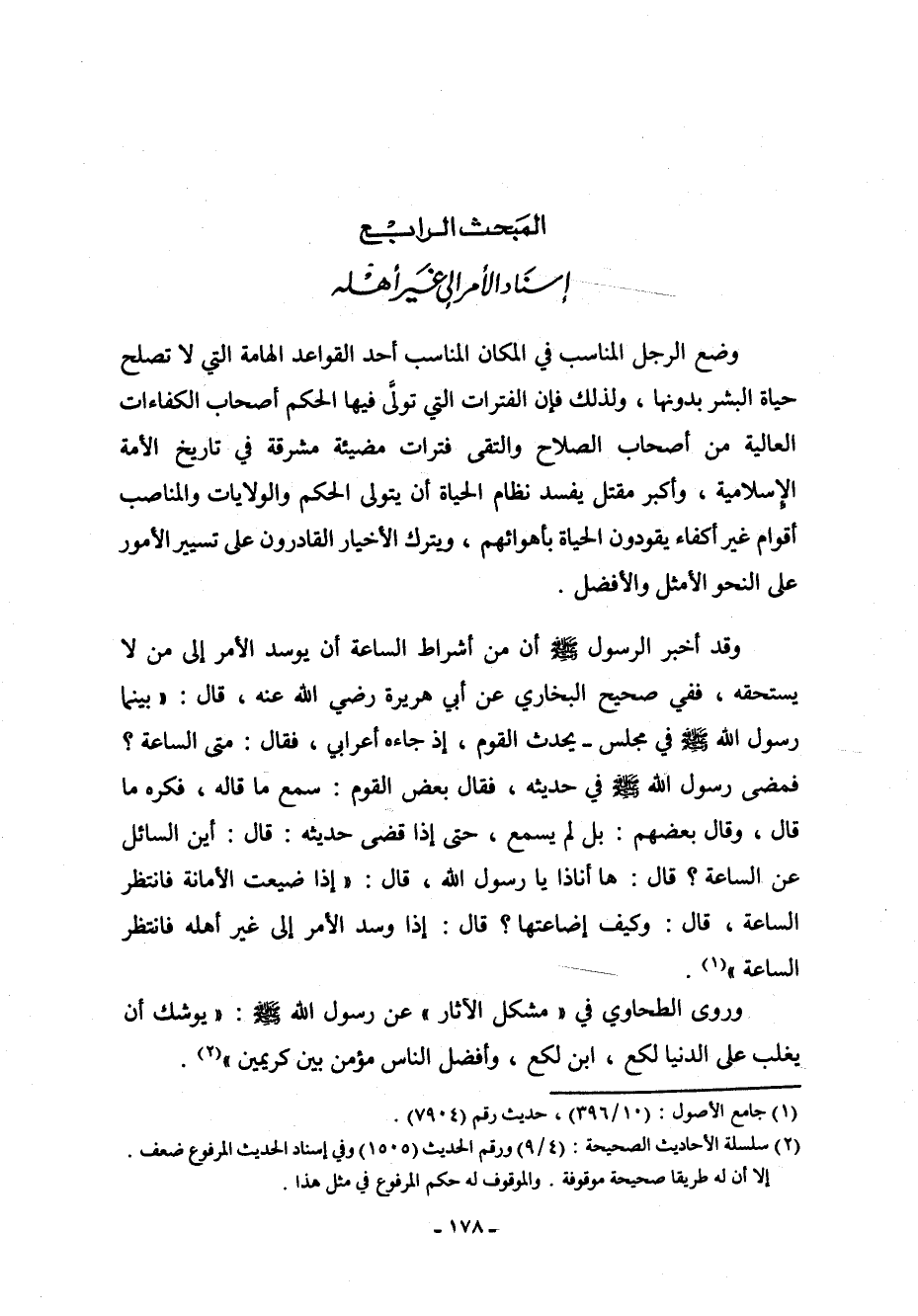 وقد أخبر الرسول صلى الله عليه وسلم أن من أشراط الساعة أن يوسَّد الأمر إلى من لا يستحقه، ففي صحيح البخاري عن أبي هريرة رضي الله عنه، قال: " بينما رسول الله صلى الله عليه وسلم في مجلس - يُحَدّث القوم، إذ جاءه أعرابي، فقال: متى الساعة؟ فمضى رسول الله صلى الله عليه وسلم في حديثه، فقال بعض القوم: سمع ما قاله، فكره ما قال، وقال بعضهم: بل لم يسمع، حتى إذا قضى حديثه: قال: أين السائل عن الساعة؟ قال: ها أنا ذا يا رسول الله، قال: " إذا ضيعت الأمانة فانتظر الساعة، قال: وكيف إضاعتها؟ قال: إذا وسد الأمر إلى غير أهله فانتظر الساعة " (¬1) .