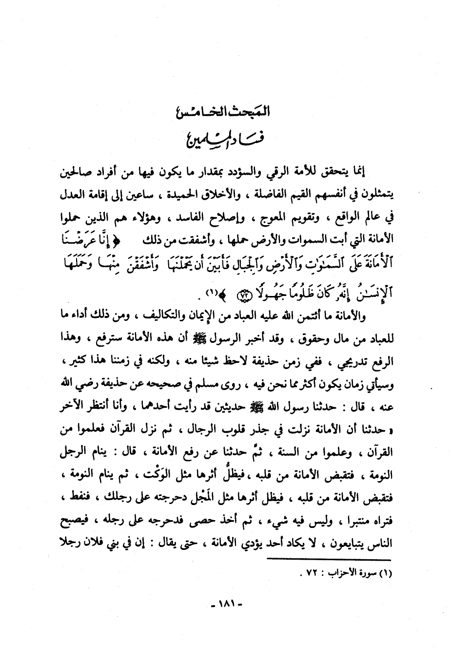 إنما يتحقق للأمة الرقي والسؤدد بمقدار ما يكون فيها من أفراد صالحين يتمثلون في أنفسهم القيم الفاضلة، والأخلاق الحميدة، ساعين إلى إقامة العدل في عالم الواقع، وتقويم المعوج، وإصلاح الفاسد، وهؤلاء هم الذين حملوا الأمانة التي أبت السماوات والأرض حملها، وأشفقت من ذلك: (إِنَّا عَرَضْنَا الْأَمَانَةَ عَلَى السَّمَاوَاتِ وَالْأَرْضِ وَالْجِبَالِ فَأَبَيْنَ أَن يَحْمِلْنَهَا وَأَشْفَقْنَ مِنْهَا وَحَمَلَهَا الْإِنسَانُ إِنَّهُ كَانَ ظَلُومًا جَهُولًا) [الأحزاب: 72] .