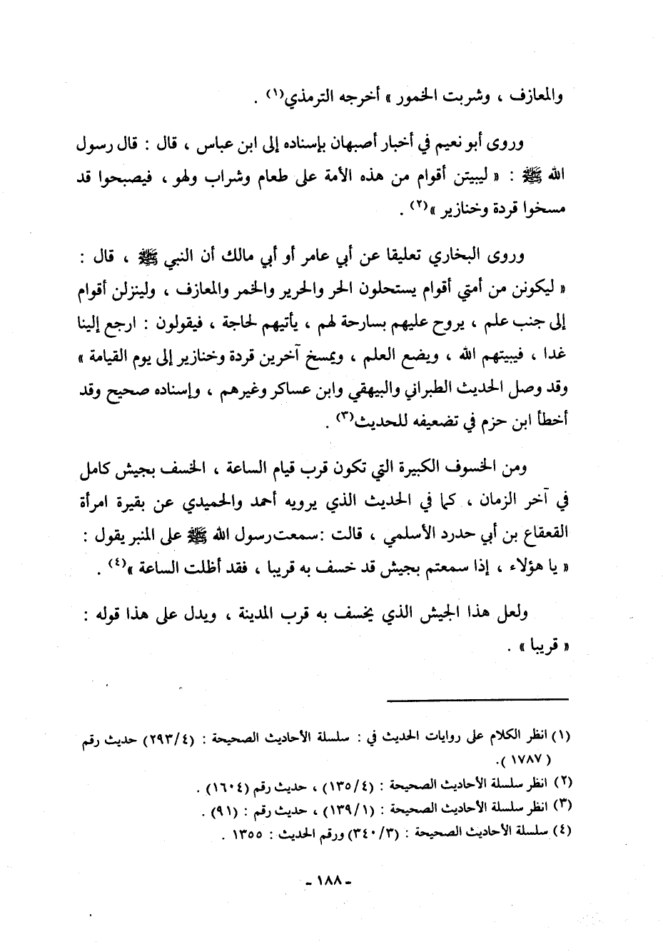 وروى البخاري تعليقاً عن أبي عامر أو أبي مالك أن النبي صلى الله عليه وسلم، قال: " ليكونن من أمتي أقوام يستحلون الحِرَ والحرير والخمر والمعازف، ولينزلن أقوام إلى جنب عَلَمٍ، يروح عليهم بسارحةٍ لهم، يأتيهم لحاجة، فيقولون: ارجع إلينا غداً، فيبيتهم الله، ويضع العلم، ويمسخ آخرين قردة وخنازير إلى يوم القيامة " وقد وصل الحديث الطبراني والبيهقي وابن عساكر وغيرهم، وإسناده صحيح، وقد أخطأ ابن حزم في تضعيفه للحديث (¬3) .