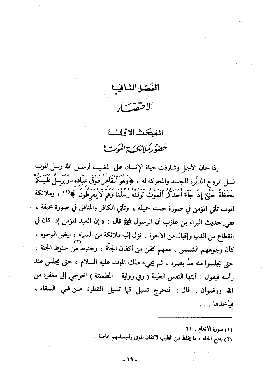 إذا حان الأجل وشارفت حياة الإنسان على المغيب أرس الله رسل الموت لسلِّ الروح المدبِّرة للجسد والمحركة له، (وَهُوَ الْقَاهِرُ فَوْقَ عِبَادِهِ وَيُرْسِلُ عَلَيْكُم حَفَظَةً حَتَّىَ إِذَا جَاء أَحَدَكُمُ الْمَوْتُ تَوَفَّتْهُ رُسُلُنَا وَهُمْ لاَ يُفَرِّطُونَ) [الأنعام: 61] ، وملائكة الموت تأتي المؤمن في صورة حسنة جميلة، وتأتي الكافر والمنافق في صورة مخيفة، ففي حديث البراء بن عازب أن الرسول صلى الله عليه وسلم قال: " إن العبد المؤمن إذا كان في انقطاع من الدنيا وإقبال من الآخرة، نزل إليه ملائكة من السماء، بيض الوجوه، كأن وجوههم الشمس، معهم كفن من أكفان الجنة، وحنوط (¬1) من حنوط الجنة، حتى يجلسوا منه مدَّ بصره، ثم يجيء ملك الموت عليه السلام، حتى يجلس عند رأسه فيقول: أيتها النفس الطيبة (وفي رواية: المطمئنة) اخرجي إلى مغفرة من الله ورضوان. قال: فتخرج تسيل كما تسيل القطرة من فيِّ السقاء، فيأخذها ...