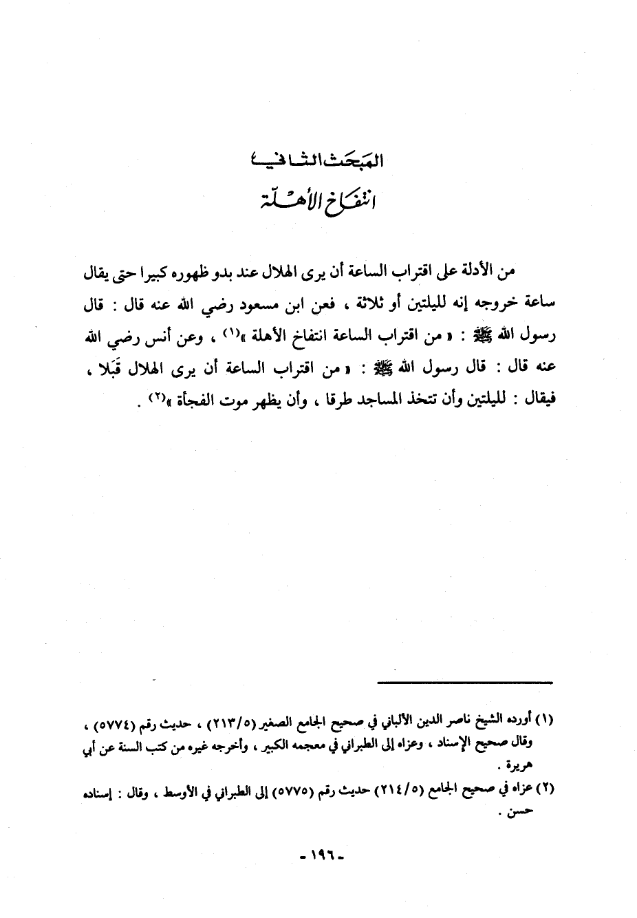 من الأدلة على اقتراب الساعة أن يرى الهلال عند بدو ظهوره كبيراً حتى يقال ساعة خروجه إنه لليلتين أو ثلاثة، فعن ابن مسعود رضي الله عنه قال: قال رسول الله صلى الله عليه وسلم: " من اقتراب الساعة انتفاخ الأهلة " (¬1) ، وعن أنس رضي الله عنه قال: قال رسول الله صلى الله عليه وسلم: " من اقتراب الساعة أن يرى الهلال قَبَلاًَ، فيقال: لليلتين وأن تتخذ المساجد طرقاً، وأن يظهر موت الفجأة " (¬2) .