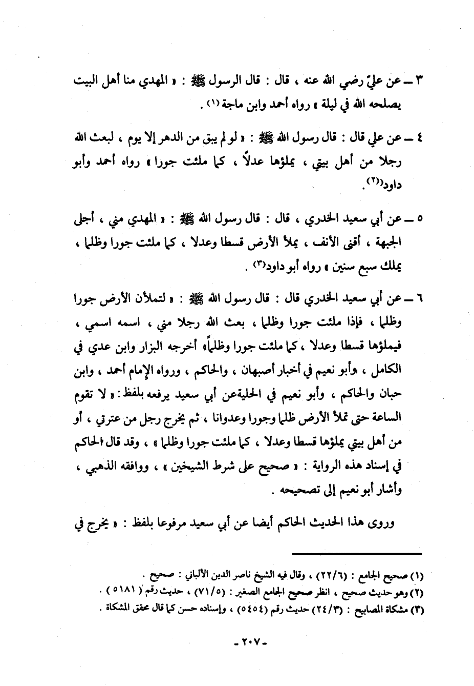 6- عن أبي سعيد الخدري قال: قال رسول الله صلى الله عليه وسلم: " لتملأن الأرض جوراً وظلماً، فإذا ملئت جوراً وظلماً، بعث الله رجلاً مني، اسمه اسمي، فيملؤها قسطاً وعدلاً، كما ملئت جوراً وظلماً " أخرجه البزار وابن عدي في الكامل، وأبو نعيم في أخبار أصبهان، والحاكم، ورواه الإمام أحمد، وابن حبان والحاكم، وأبو نعيم في الحلية عن أبي سعيد يرفعه بلفظ: " لا تقوم الساعة حتى تملأ ظلماً وجوراً وعدواناً، ثم يخرج رجل من عترتي، أو من أهل بيتي يملؤها قسطاً وعدلاً، كما ملئت جوراً وظلماً "، وقد قال الحاكم في إسناد هذه الرواية: " صحيح على شرط الشيخين "، ووافقه الذهبي، وأشار أبو نعيم إلى تصحيحه.