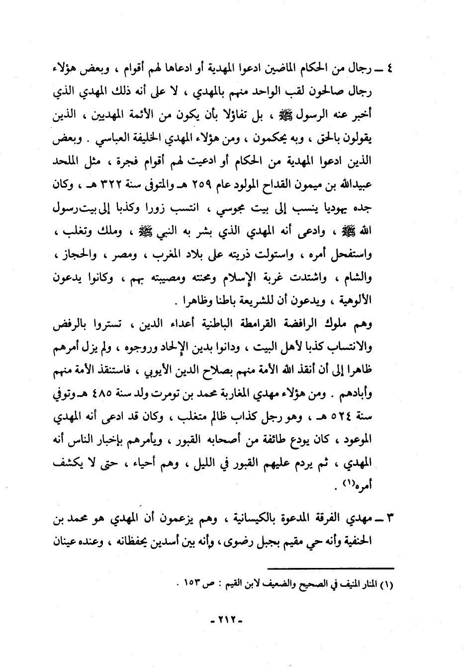 4- رجال من الحكام الماضين ادعوا المهدية أو ادعاها لهم أقوام، وبعض هؤلاء رجال صالحون لقب الواحد منهم بالمهدي، لا على أنه ذلك المهدي الذي أخبر عنه الرسول صلى الله عليه وسلم، بلا تفاؤلاً بأن يكون من الأئمة المهديين، الذين يقولون بالحق، وبه يحكمون، ومن هؤلاء المهدي الخليفة العباسي. وبعض الذين ادعوا المهدية من الحكام أو ادعيت لهم أقوام فجرة، مثل الملحد عبيد الله بن ميمون القداح المولود عام 259هـ والمتوفى سنة 322هـ، وكان جده يهودياً ينسب إلى بيت مجوسي، انتسب زوراً وكذباً إلى بيت رسول الله صلى الله عليه وسلم، وادعى أنه المهدي الذي بشر به النبي صلى الله عليه وسلم، وملك وتغلب، واستفحل أمره، واستولت ذريته على بلاد المغرب، ومصر، والحجاز، والشام، واشتدت غربة الإسلام ومحنته ومصيبته بهم، وكانوا يدعون الألوهية، ويدعون أن للشريعة باطناً وظاهراً.
