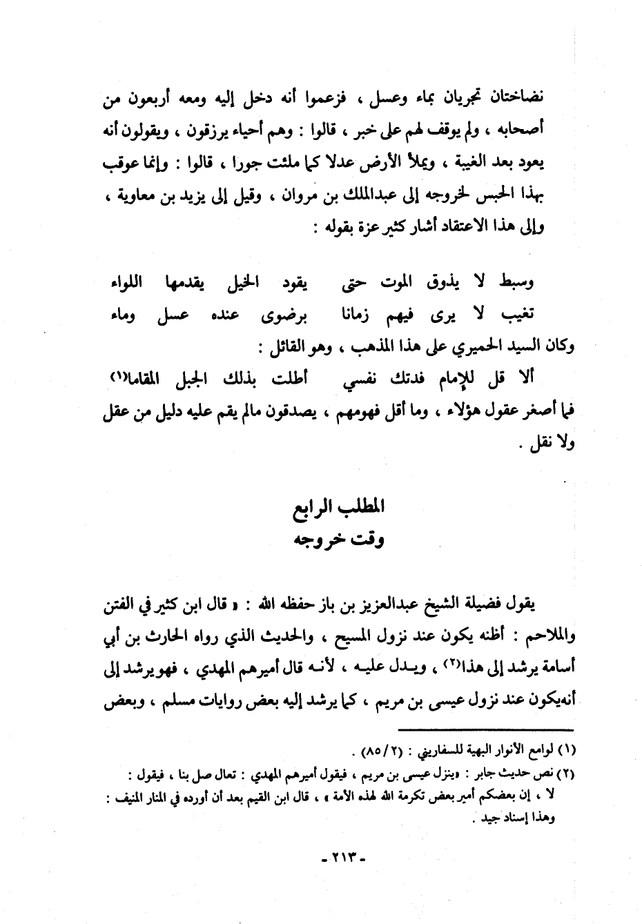 (¬2) نص حديث جابر: " ينزل عيسى ابن مريم، فيقول أميرهم المهدي: تعال صل بنا، فيقول: لا، إن بعضكم أمير بعض تكرمة الله لهذه الأمة " قال ابن القيم بعد أن أورده في المنار المنيف: وهذا إسناد جيد.