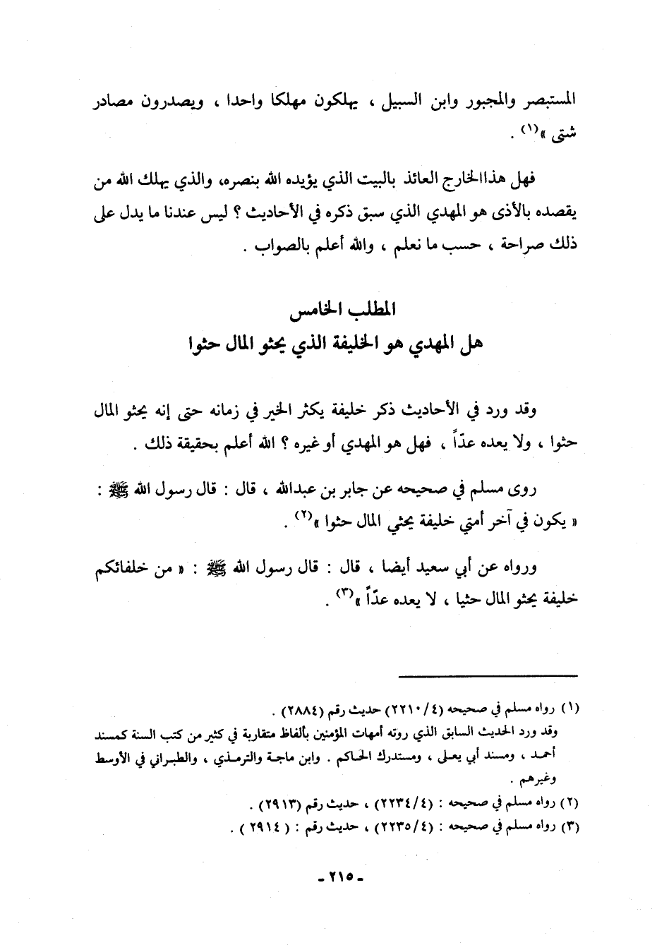روى مسلم في صحيحه عن جابر بن عبد الله، قال: قال رسول الله صلى الله عليه وسلم: " يكون في آخر أمتي خليفة يحثي المال حثواً " (¬2) .