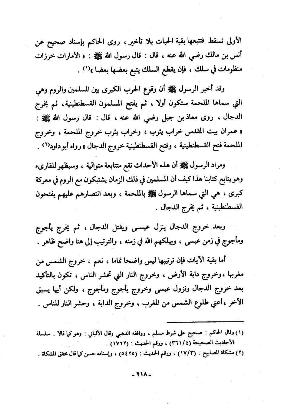 ومراد الرسول صلى الله عليه وسلم أن هذه الأحداث تقع متتابعة متوالية، وسيظهر للقارئ وهو يتابع كتابنا هذا كيف أن المسلمين في ذلك الزمان يشتبكون مع الروم في معركة كبرى، هي التي سماها الرسول صلى الله عليه وسلم بالملحمة، وبعد انتصارهم عليهم يفتحون القسطنطينية، ثم يخرج الدجال.