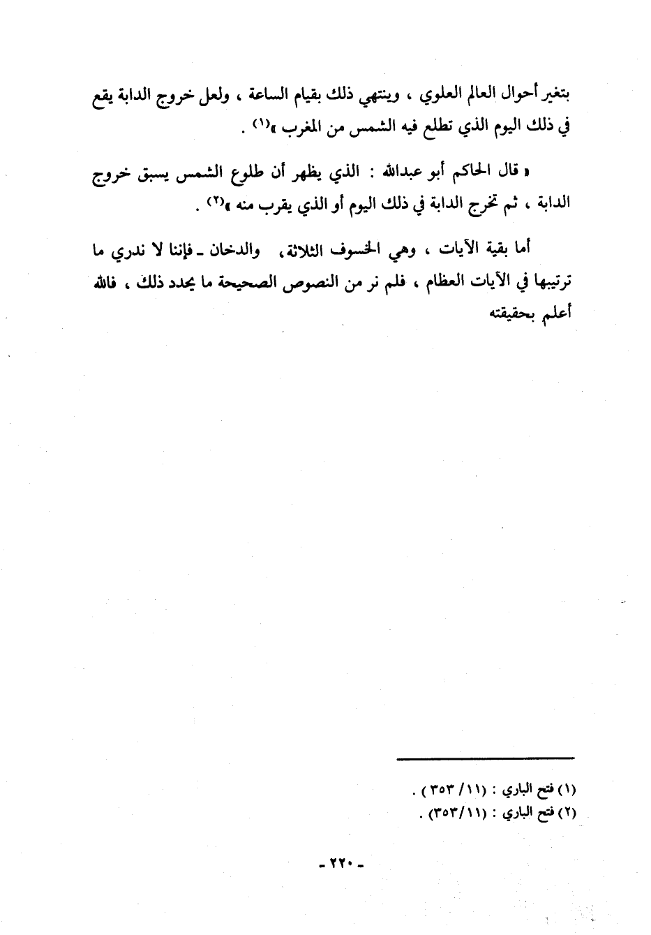 بتغير أحوال العالم العلوي، وينتهي ذلك بقيام الساعة، ولعل خروج الدابة يقع في ذلك اليوم الذي تطلع فيه الشمس من المغرب " (¬1) .