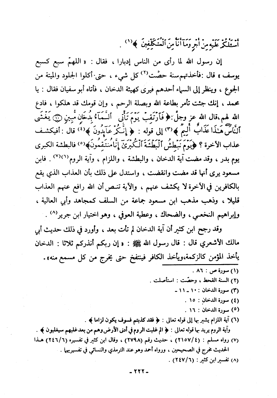 إن رسول الله صلى الله عليه وسلم لما رأى من الناس إدباراً، فقال: " اللهمّ سبع كسبع يوسف " قال: فأخذتهم سنة حصَّت (¬1) كل شيء، حتى أكلوا الجلود والميتة من الجوع، وينظر إلى السماء أحدهم فيرى كهيئة الدخان، فأتاه أبو سفيان فقال: يا محمد، إنك جئت تأمر بطاعة الله وبصلة الرحم، وإن قومك قد هلكوا، فادع الله لهم، قال الله عز وجل: (فَارْتَقِبْ يَوْمَ تَأْتِي السَّمَاء بِدُخَانٍ مُّبِينٍ - يَغْشَى النَّاسَ هَذَا عَذَابٌ أَلِيمٌ) [الدخان: 10-11] إلى قوله: (إِنَّكُمْ عَائِدُونَ) [الدخان: 15] ، قال: أفيكشف عذاب الآخرة: (يَوْمَ نَبْطِشُ الْبَطْشَةَ الْكُبْرَى إِنَّا مُنتَقِمُونَ) [الدخان: 16] فالبطشة الكبرى يوم بدر، وقد مضت آية الدخان، والبطشة، واللزام، وآية الروم (¬2) (¬3) . فابن مسعود يرى أنها قد مضت وانقضت، واستدل على ذلك بأن العذاب الذي يقع بالكافرين في الآخرة لا يكشف عنهم، والآية تنص أن الله رافع عنهم العذاب قليلاً، وذهب مذهب ابن مسعود جماعة من السلف كمجاهد وأبي العالية، وإبراهيم النخعي، والضحاك، وعطية العوفي، وهو اختيار ابن جرير (¬4) .
