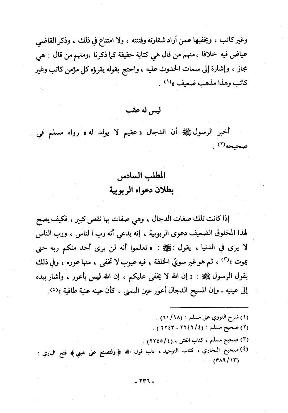 إذا كانت تلك صفات الدجال، وهي صفات بها نقص كبير، فكيف يصح لهذا المخلوق الضعيف دعوى الربوبية، إنه يدعي أنه رب الناس، ورب الناس لا يرى في الدنيا، يقول صلى الله عليه وسلم: " تعلموا أنه لن يرى أحد منكم ربه حتى يموت " (¬3) ، ثم هو غير سويّ الخلقة، فيه عيوب لا تخفى، منها عوره، وفي ذلك يقول الرسول صلى الله عليه وسلم: " إن الله لا يخفى عليكم، إن الله ليس بأعور، وأشار بيده إلى عينيه - وإن المسيح الدجال أعور عين اليمنى، كأن عينه عنبة طافية " (¬4) .