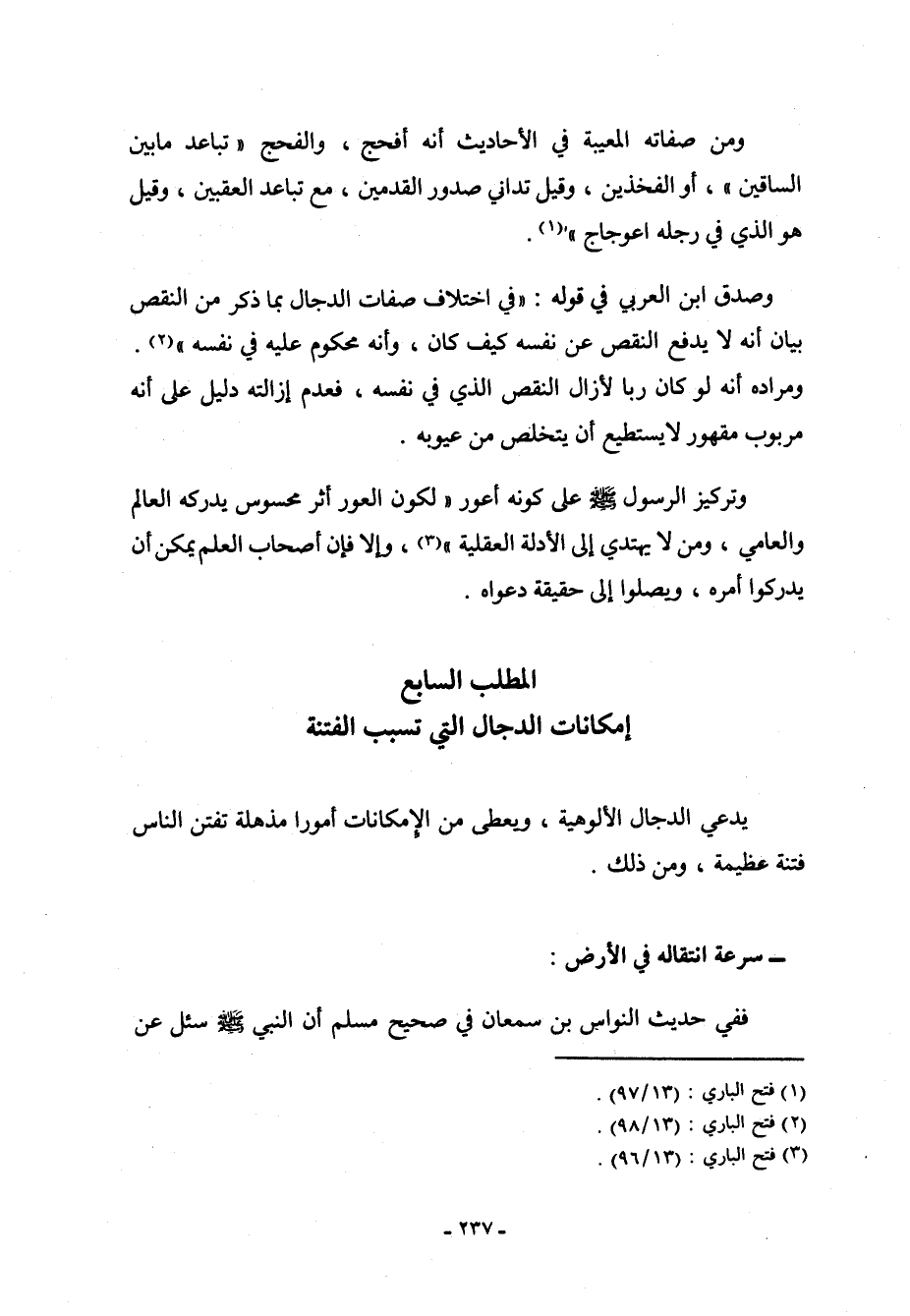 وتركيز الرسول صلى الله عليه وسلم على كونه أعور " لكون العور أثر محسوس يدركه العالم والعامي، ومن لا يهتدي إلى الأدلة العقلية " (¬3) ، وإلا فإن أصحاب العلم يمكن أن يدركوا أمره، ويصلوا إلى حقيقة دعواه.