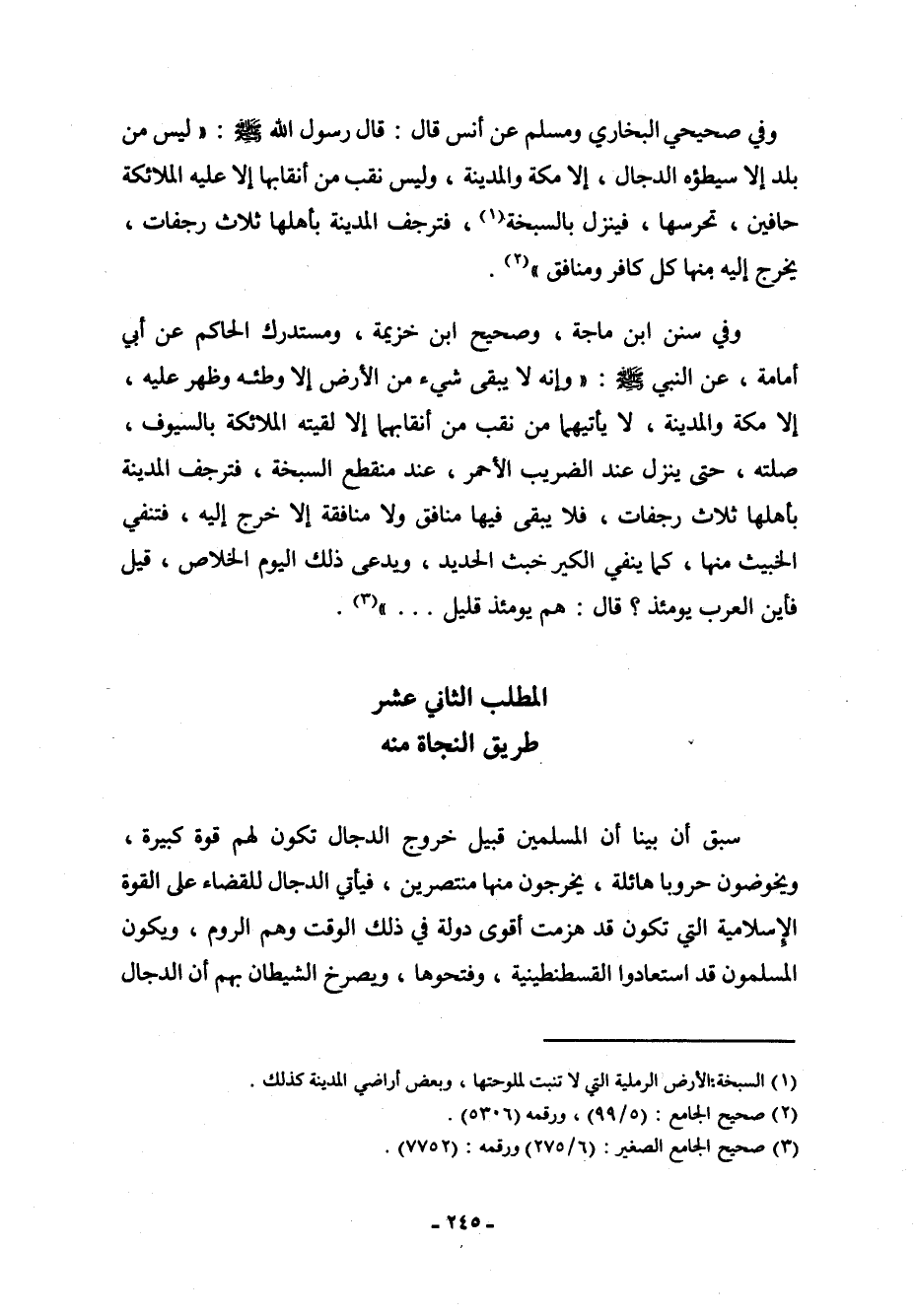 وفي سنن ابن ماجة، وصحيح ابن خزيمة، ومستدرك الحاكم عن أبي أمامة، عن النبي صلى الله عليه وسلم: " وإنه لا يبقى شيء من الأرض إلا وطئه وظهر عليه، إلا مكة والمدينة، لا يأتيهما من نقب من أنقابهما إلا لقيته الملائكة بالسيوف، صلته، حتى ينزل عند الضريب الأحمر، عند منقطع السبخة، فترجف المدينة بأهلها ثلاث رجفات، فلا يبقى فيها منافق ولا منافقة إلا خرج إليه، فتنفي الخبيث منها، كما ينفي الكير خبث الحديد، ويدعى ذلك اليوم الخلاص، قيل: فأين العرب يومئذ؟ قال: هم يومئذ قليل.." (¬3) .