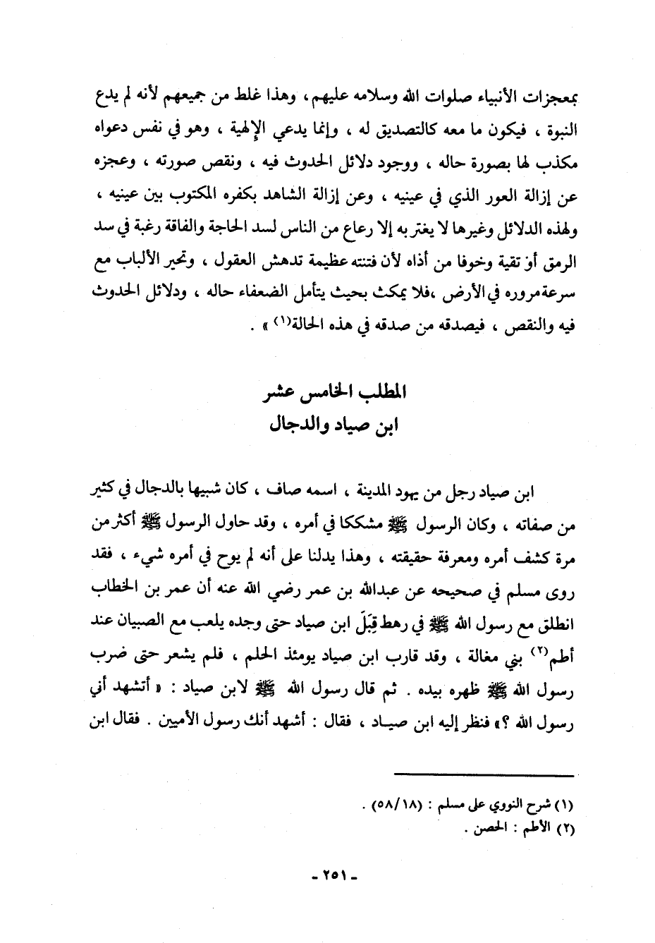 ابن صياد رجل من يهود المدينة، اسمه صاف، كان شبيهاً بالدجال في كثير من صفاته، وكان الرسول صلى الله عليه وسلم مشككاً في أمره، وقد حاول الرسول صلى الله عليه وسلم أكثر من مرة كشف أمره ومعرفة حقيقته، وهذا يدلنا على أنه لم يوح له في أمره شيء، فقد روى مسلم في صحيحه عن عبد الله بن عمر رضي الله عنه أن عمر بن الخطاب انطلق مع رسول الله صلى الله عليه وسلم في رهط قِبَل ابن صياد حتى وجده يلعب مع الصبيان عند أطُمِ (¬2) بني مغالة، وقد قارب ابن صياد يومئذ الحلم، فلم يشعر حتى ضرب رسول الله صلى الله عليه وسلم ظهره بيده. ثم قال رسول الله صلى الله عليه وسلم لابن صياد: " أتشهد أني رسول الله؟ " فنظر إليه ابن صياد، فقال: أشهد أنك رسول الأميين. فقال ابن
