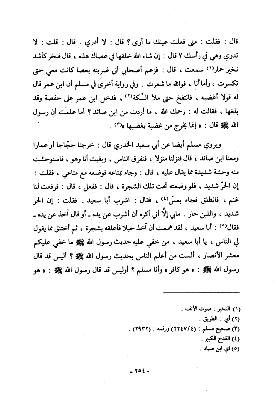 ويروي مسلم أيضاً عن أبي سعيد الخدري قال: خرجنا حجاجاً أو عماراً ومعنا ابن صائد، قال فنزلنا منزلاً، فتفرق الناس، وبقيت أنا وهو، فاستوحشت منه وحشة شديدة مما يقال عليه، قال: وجاء بمتاعه فوضعه مع متاعي، فقلت: إن الحر الشديد، فلو وضعته تحت تلك الشجرة، قال: ففعل، قال: فرفعت لنا غنم، فانطلق فجاء بعسّ (¬4) ، فقال: اشرب أبا سعيد. فقلت: إن الحر شديد، واللبن حار. ما بي إلا أني أكره أن أشرب عن يده - أو قال: آخذ عن يده - فقال (¬5) : أبا سعيد، لقد هممت أن آخذ حبلاً فأعلقه بشجرة، ثم أختنق مما يقول لي الناس، يا أبا سعيد، من خفي عليه حديث رسول الله صلى الله عليه وسلم ما خفي عليكم معشر الأنصار، ألست من أعلم الناس بحديث رسول الله صلى الله عليه وسلم؟ أليس قد قال رسول الله صلى الله عليه وسلم: " هو كافر " وأنا مسلم؟ أو ليس قد قال رسول الله صلى الله عليه وسلم: " هو
